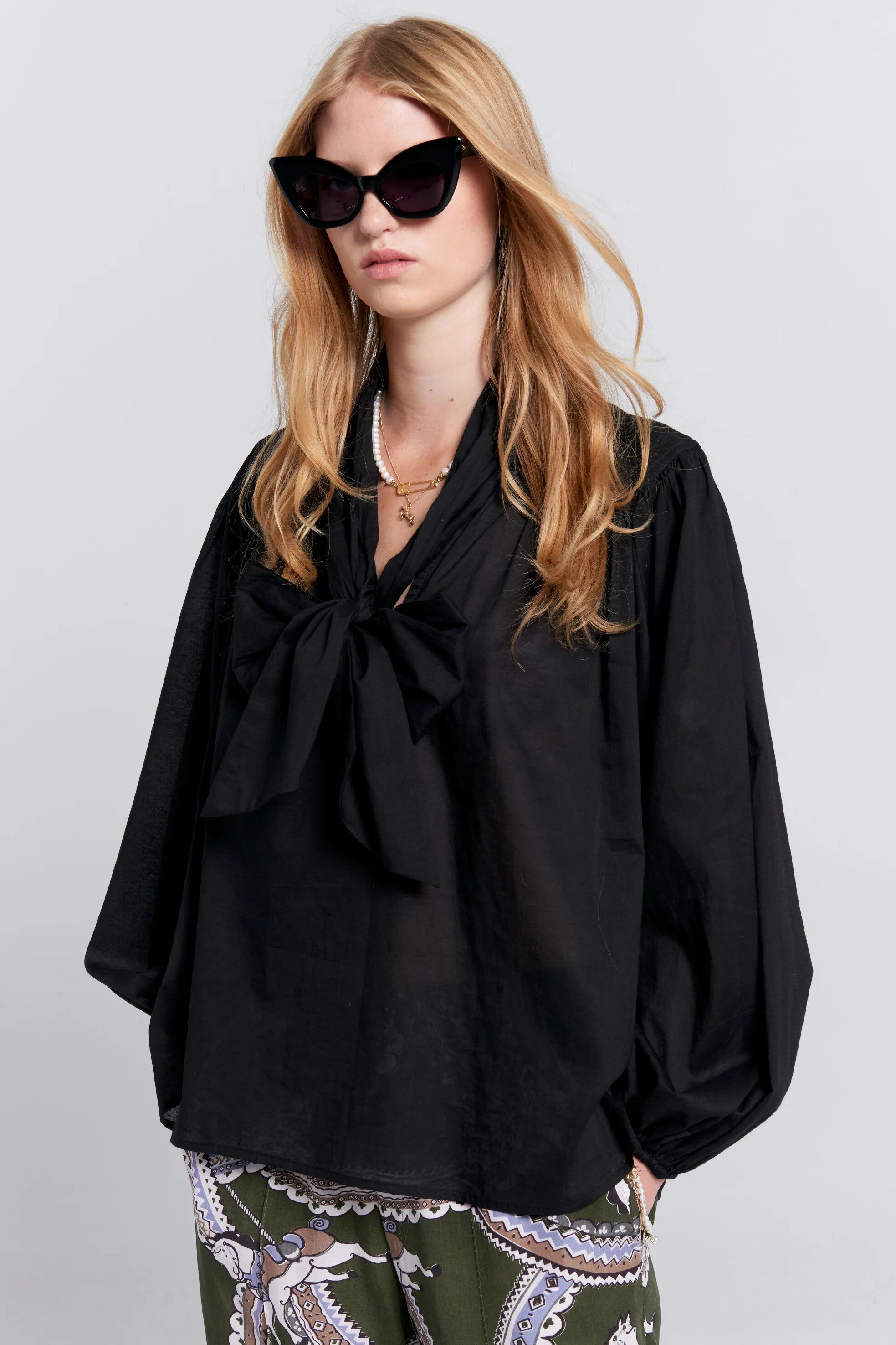 Defined by a western yoke and exaggerated pussy bow, this relaxed silhouette is a versatile wardrobe staple.
