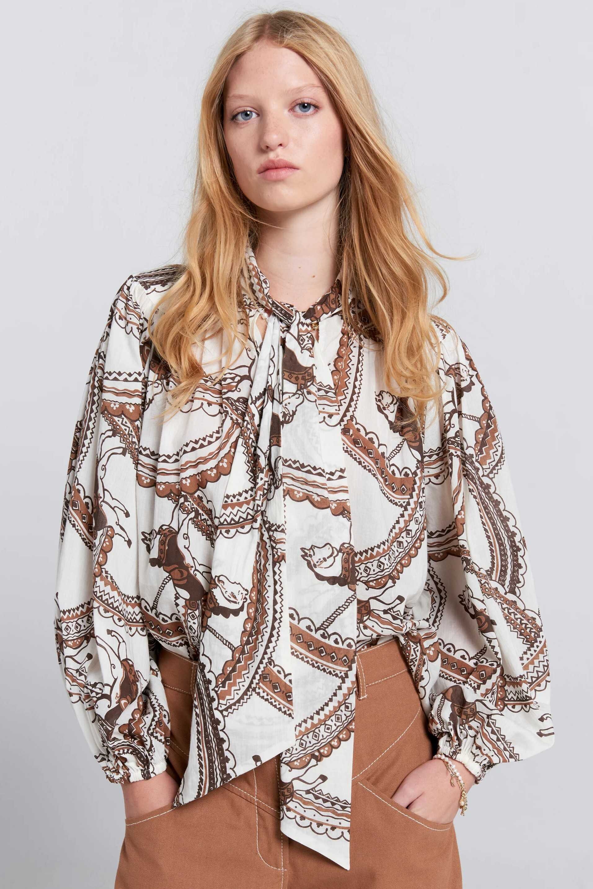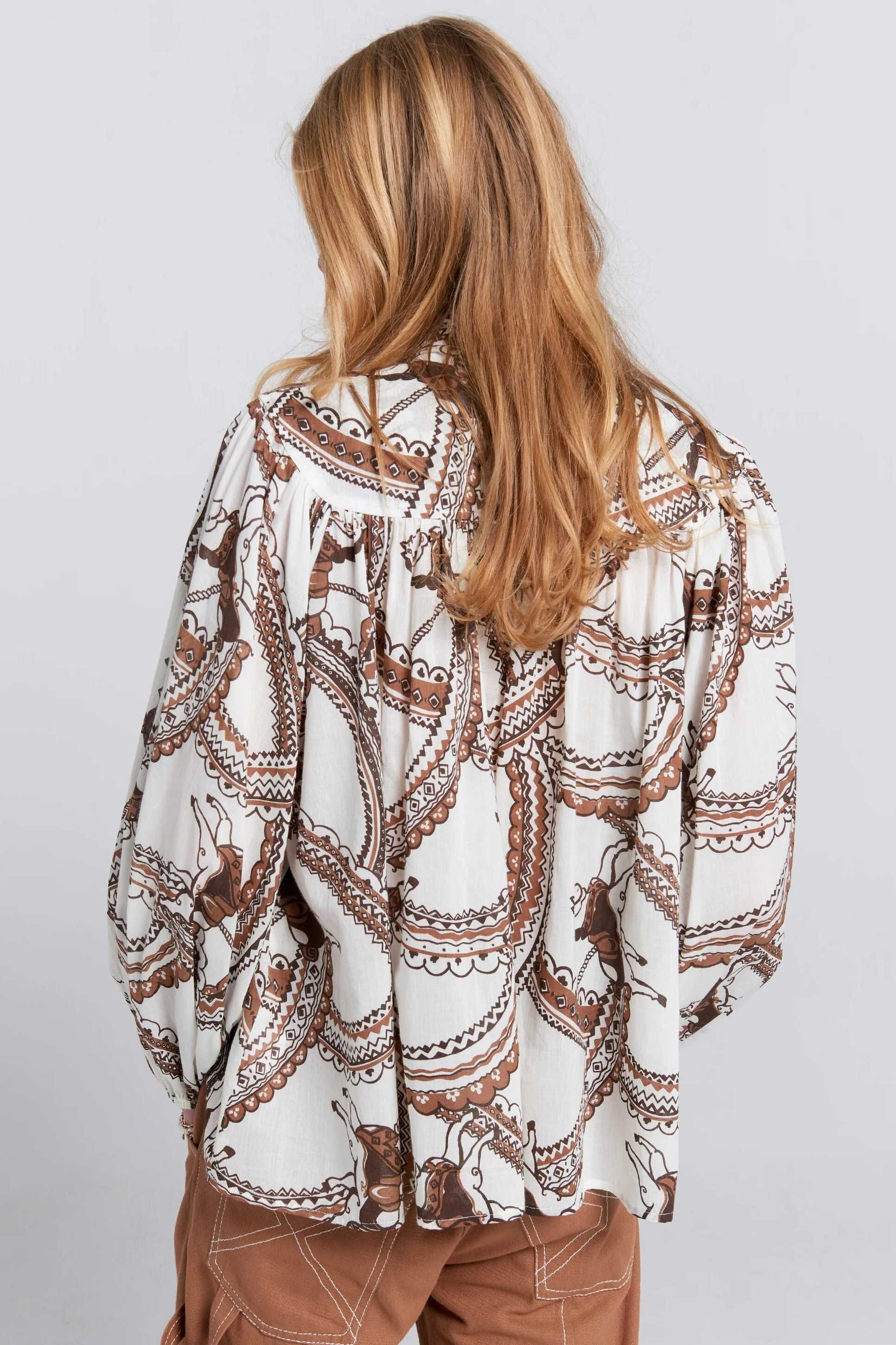 Crafted from soft Organic Cotton Voile, the Reining Bow Blouse features the signature Carousel Horse print.
