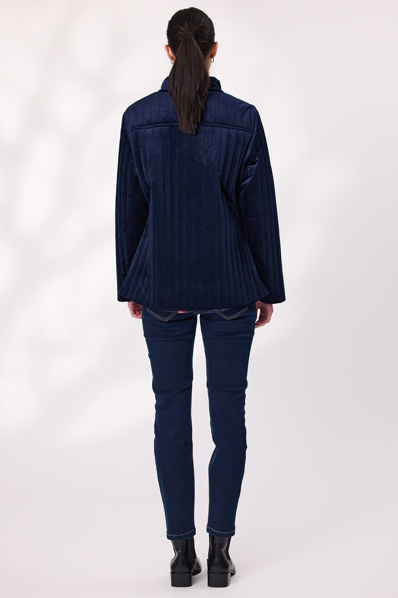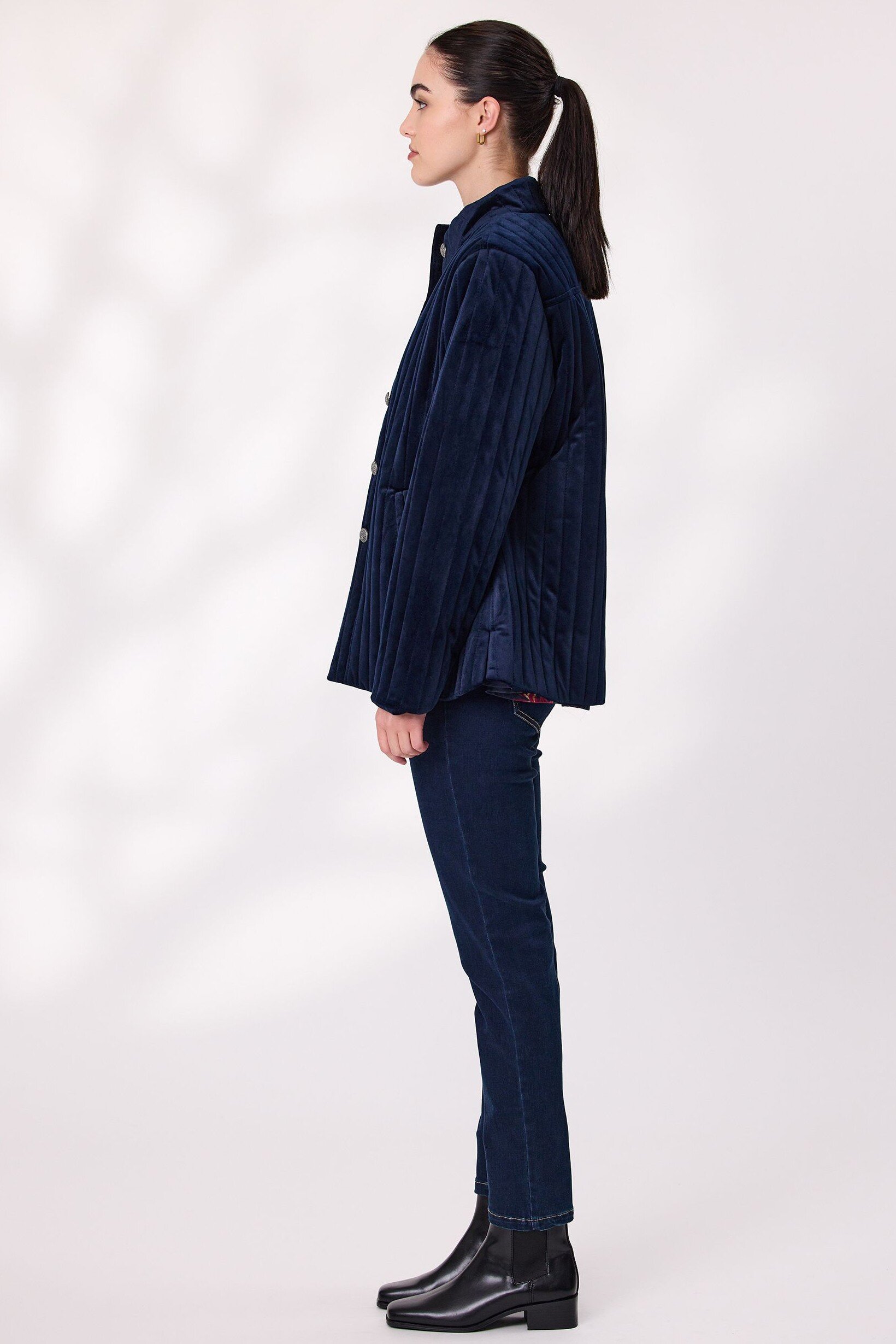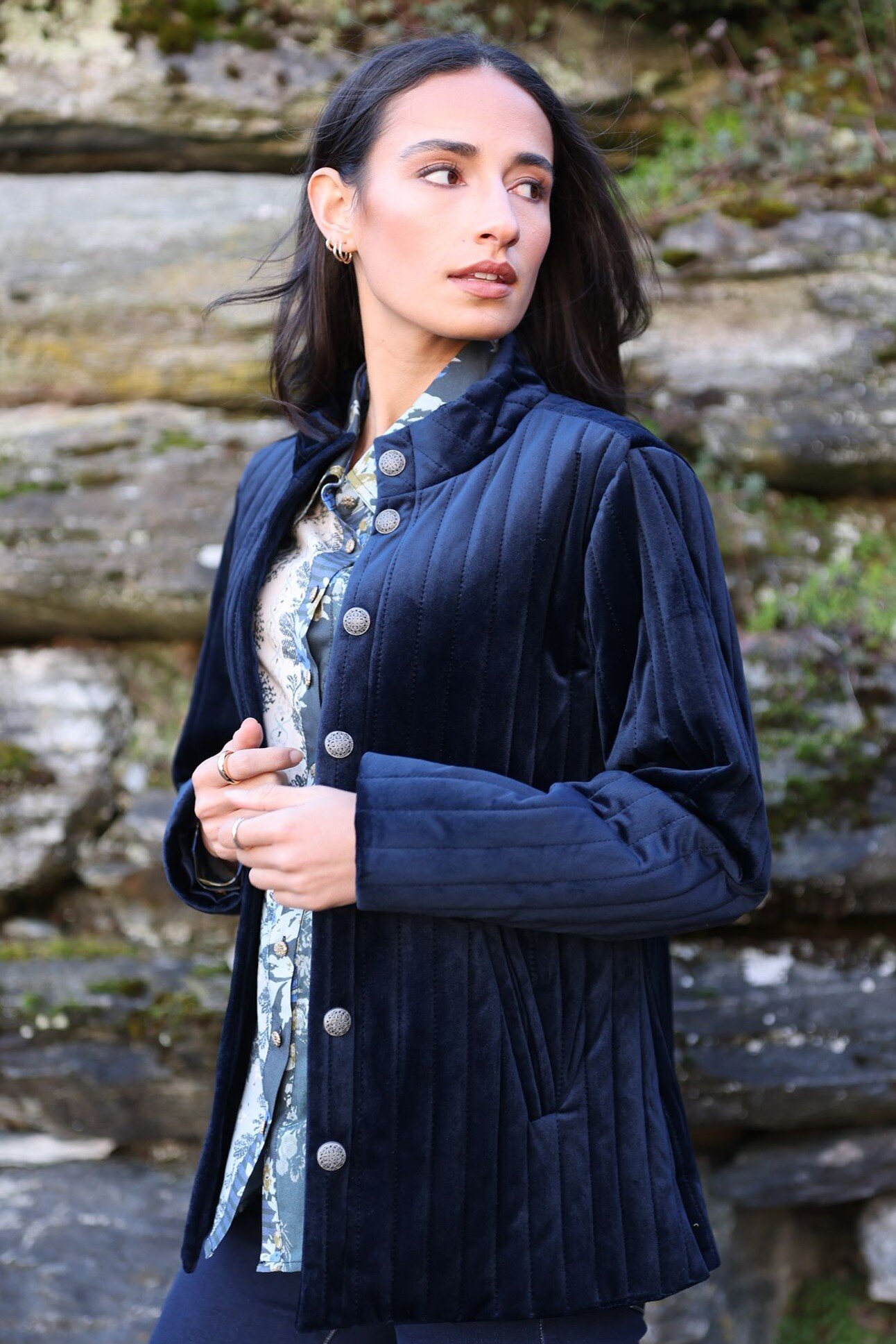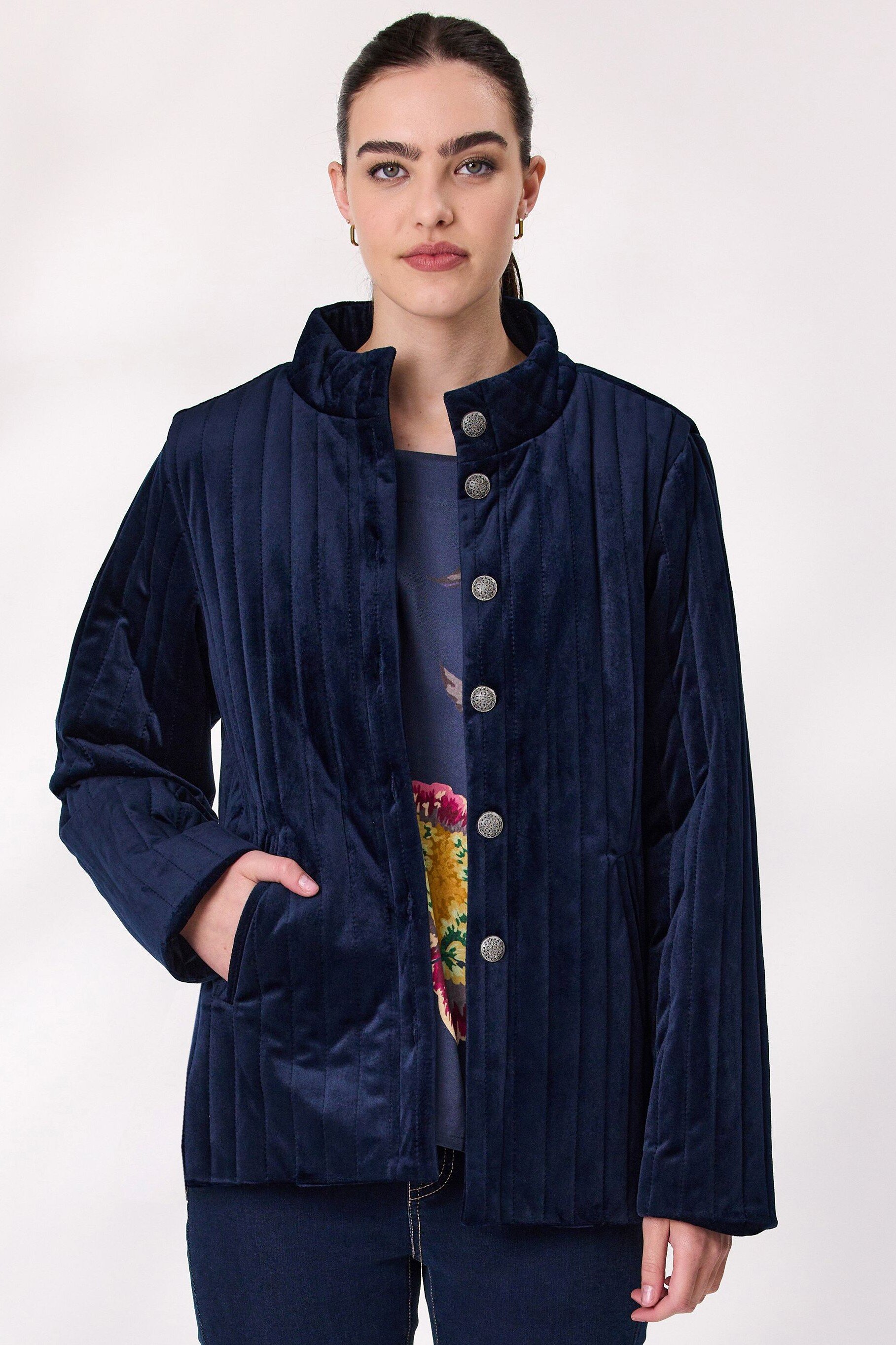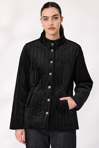 Elevate your outerwear with this quilted velvet jacket, designed for comfort and sophistication. Featuring a soft velvet finish, full lining, classic button-up front and front pockets. The structured collar and quilted texture add timeless appeal. Ideal for cool-weather styling.
