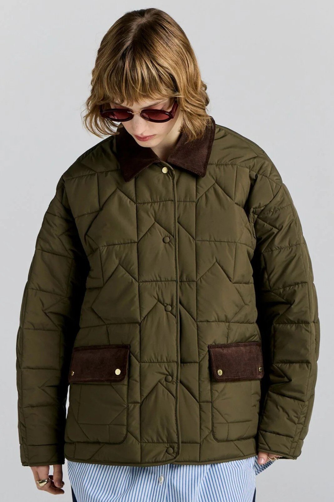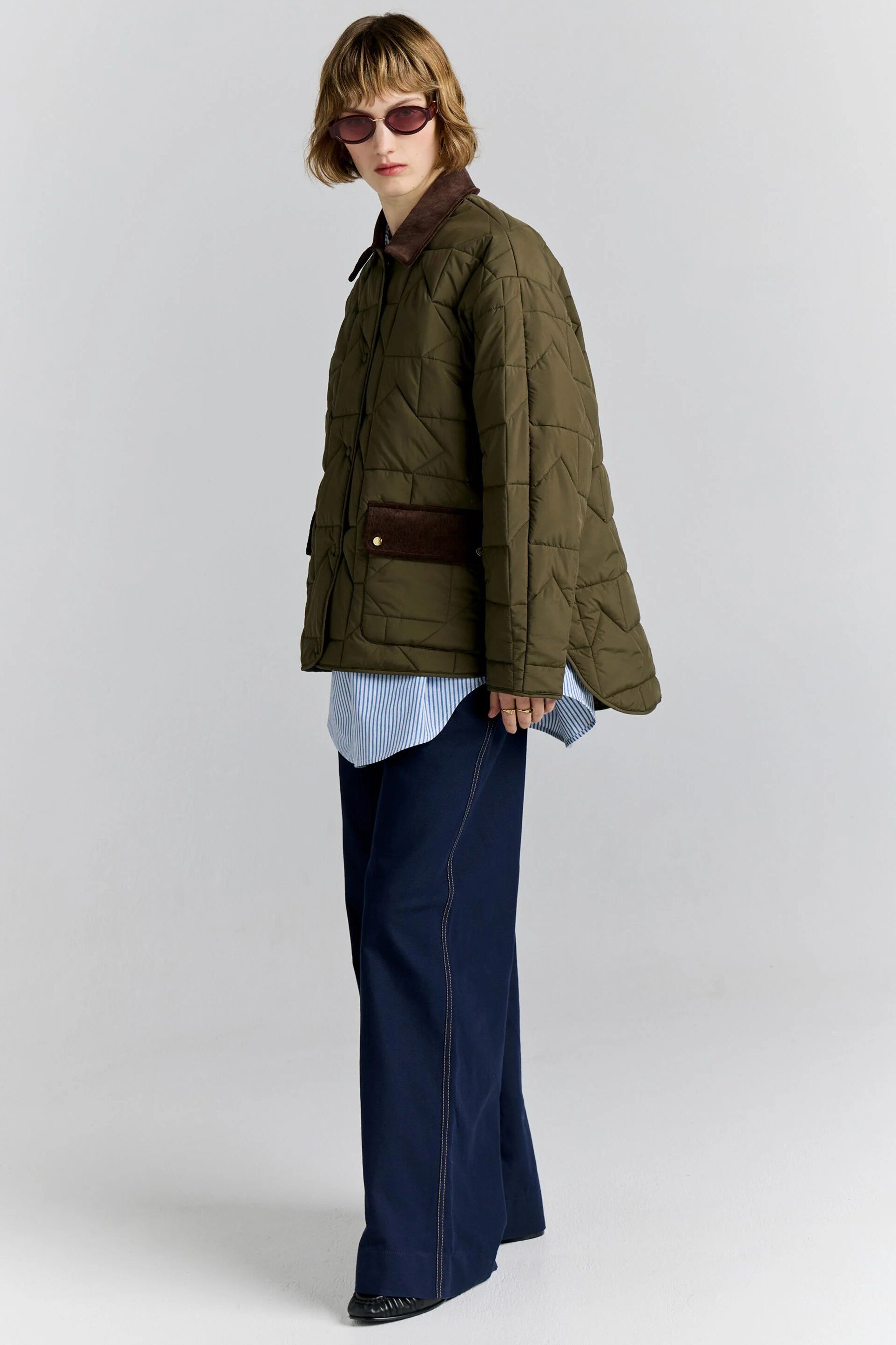 Finished in KW monogram quilting, it’s detailed with a corduroy collar and pocket flap trim that subtly break up the silhouette.