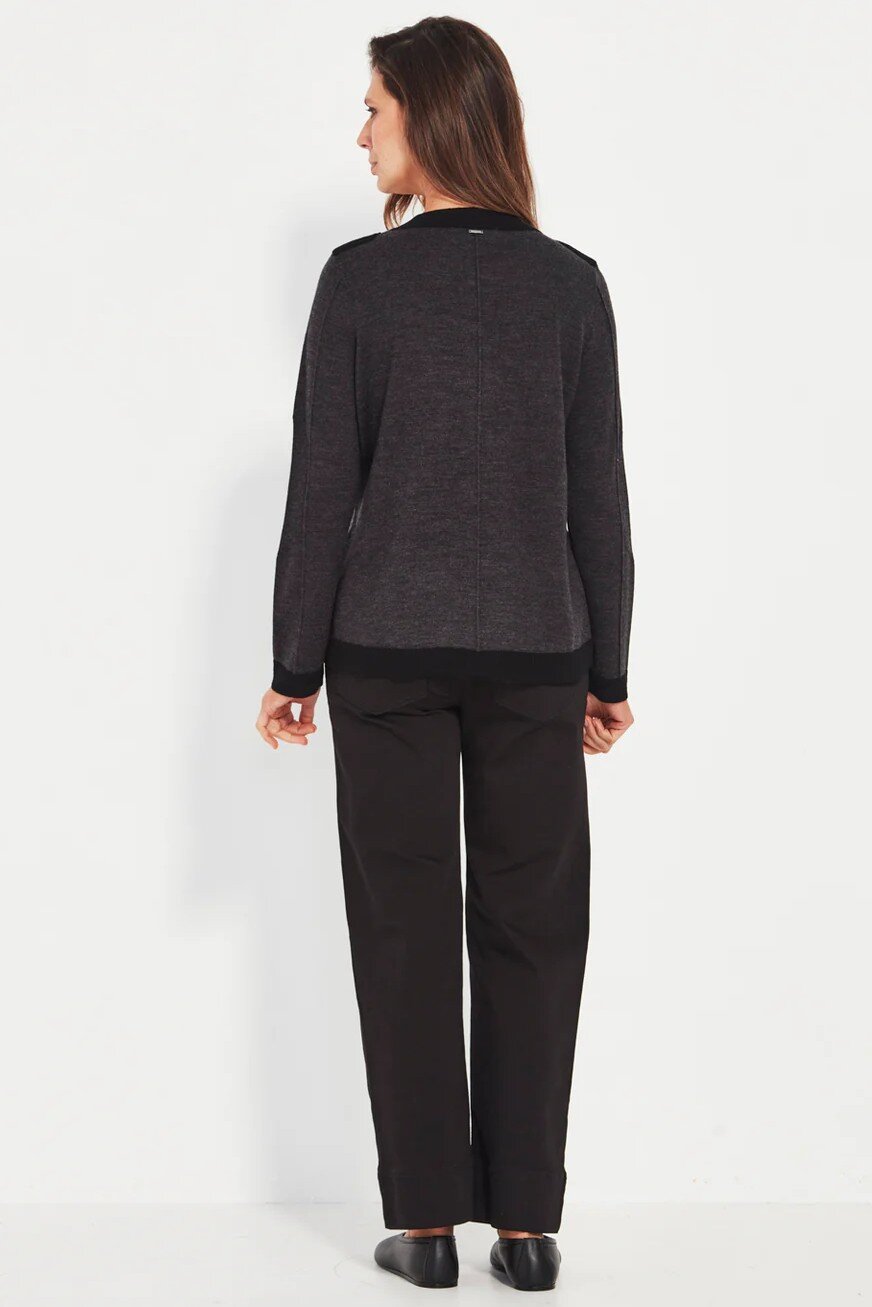 The Royal Cardi is crafted from 100% Merino, offering natural softness, warmth, and a beautifully smooth drape. The crew neckline keeps the look clean and classic, while the two-tone design adds a modern, understated contrast.