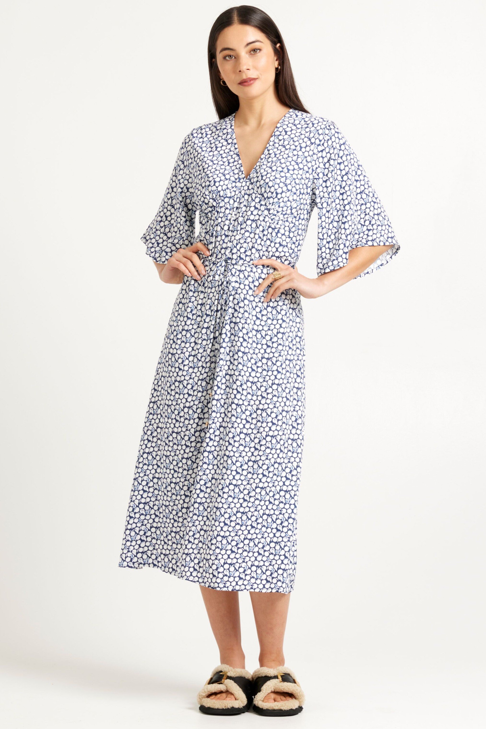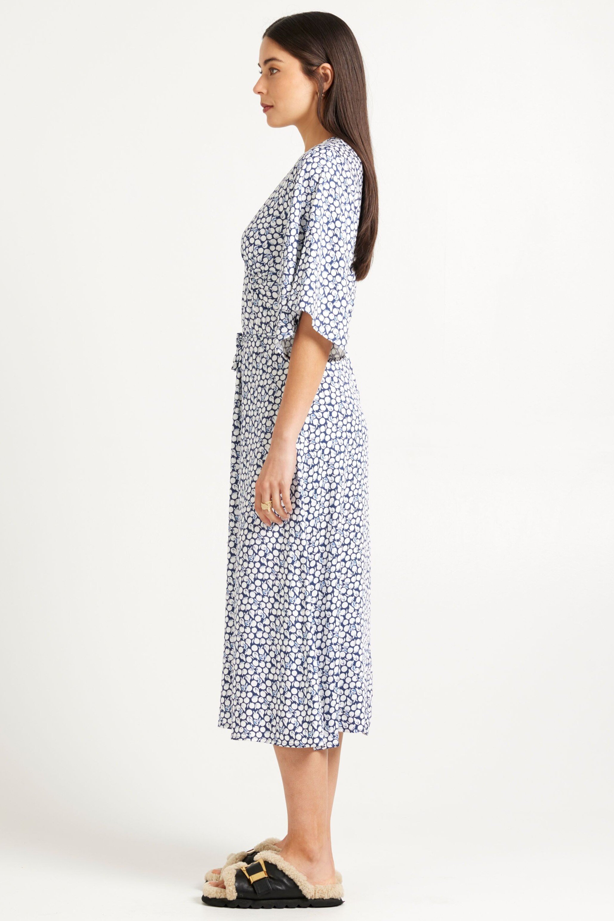 The Rubie Dress ticks all the boxes for work appropriate with a V neckline that finishes in just the right spot, flattering fluted sleeves to the elbow, relaxed movement through the skirt, and easy midi length on the leg – all in a subtle navy and white print.