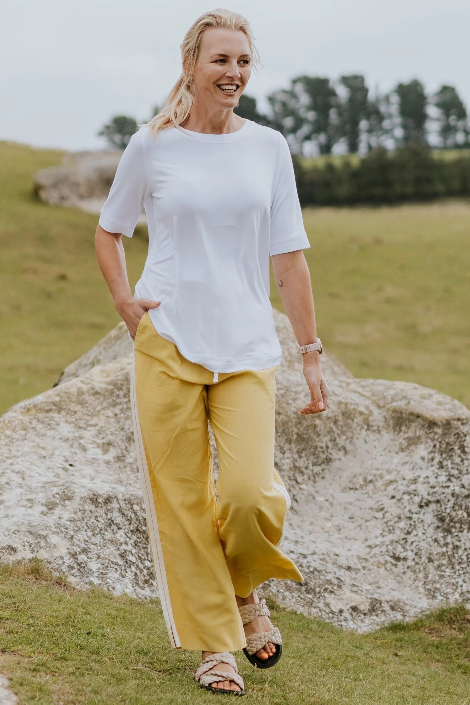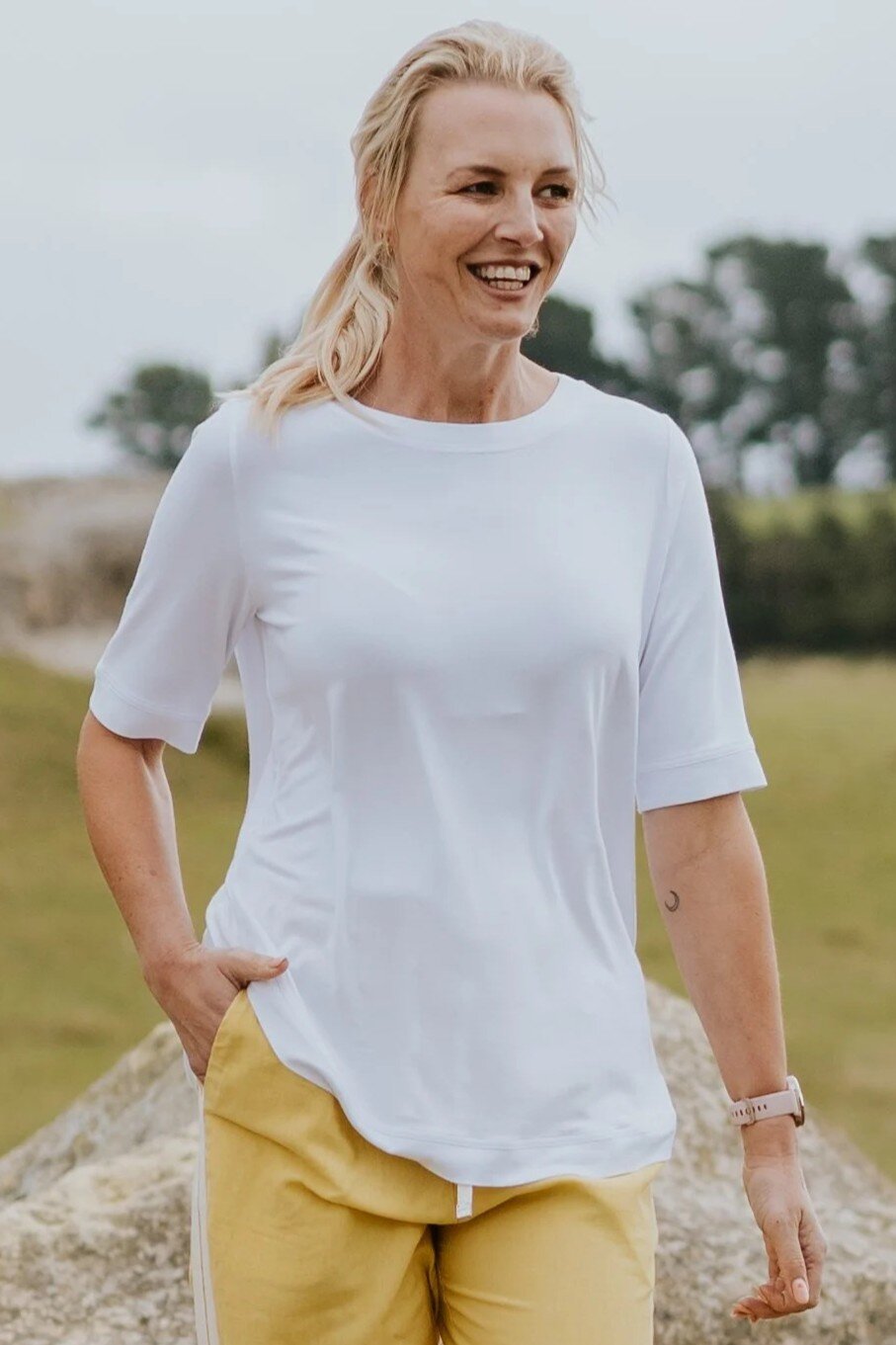 The Ruby T-shirt, crafted from a luxurious blend of Modal and spandex for a silky soft feel against the skin. This lightweight piece is designed for ultimate summer comfort and effortless style, featuring a relaxed silhouette that drapes beautifully without clinging. The elbow-length sleeves and graceful boat neckline offer a sophisticated touch, while the curved hemline adds an elegant finish. Whether dressed up or down, the Ruby T-shirt brings a perfect balance of chic and casual summer dressing, ideal for all-day wear
