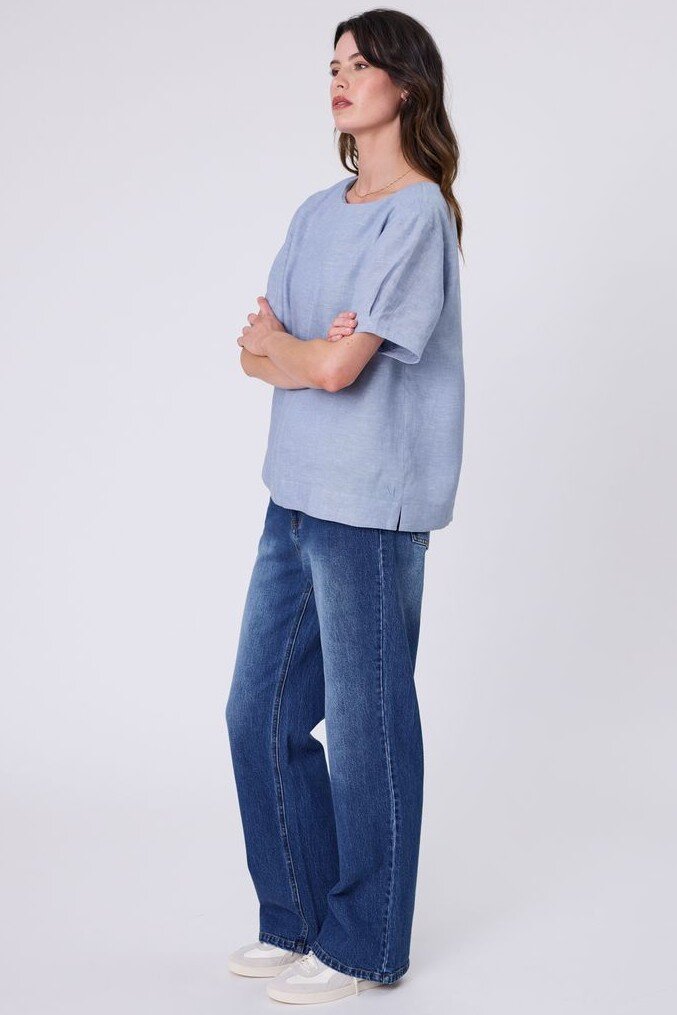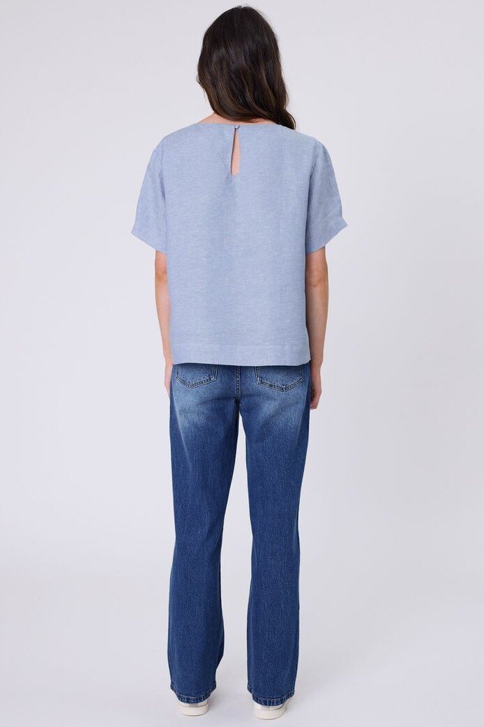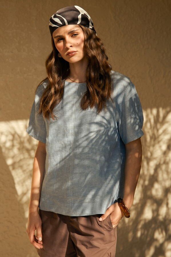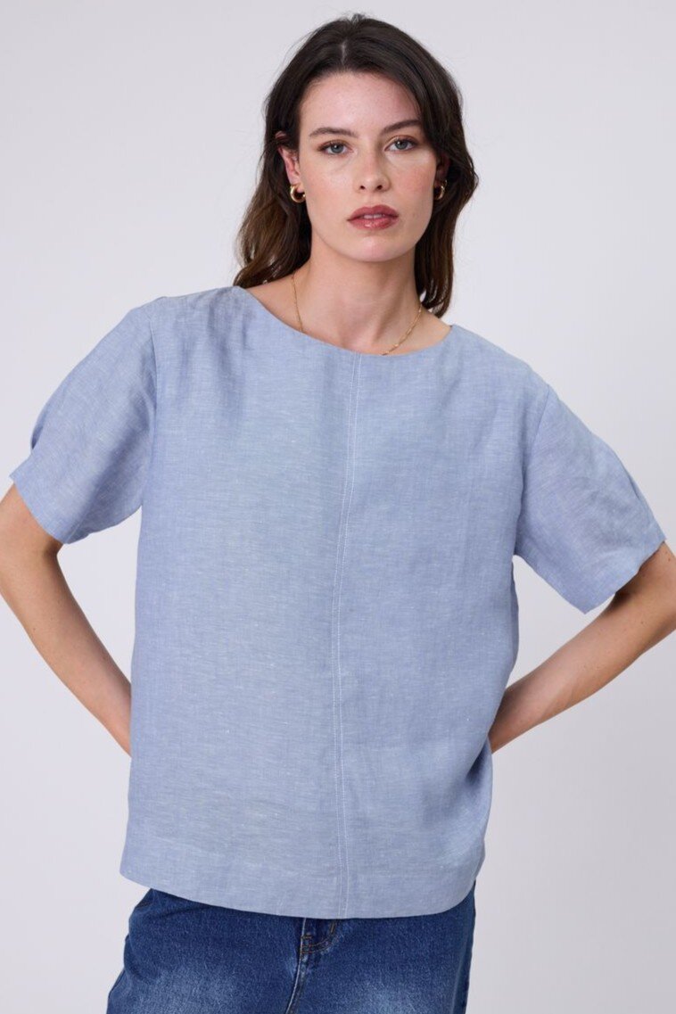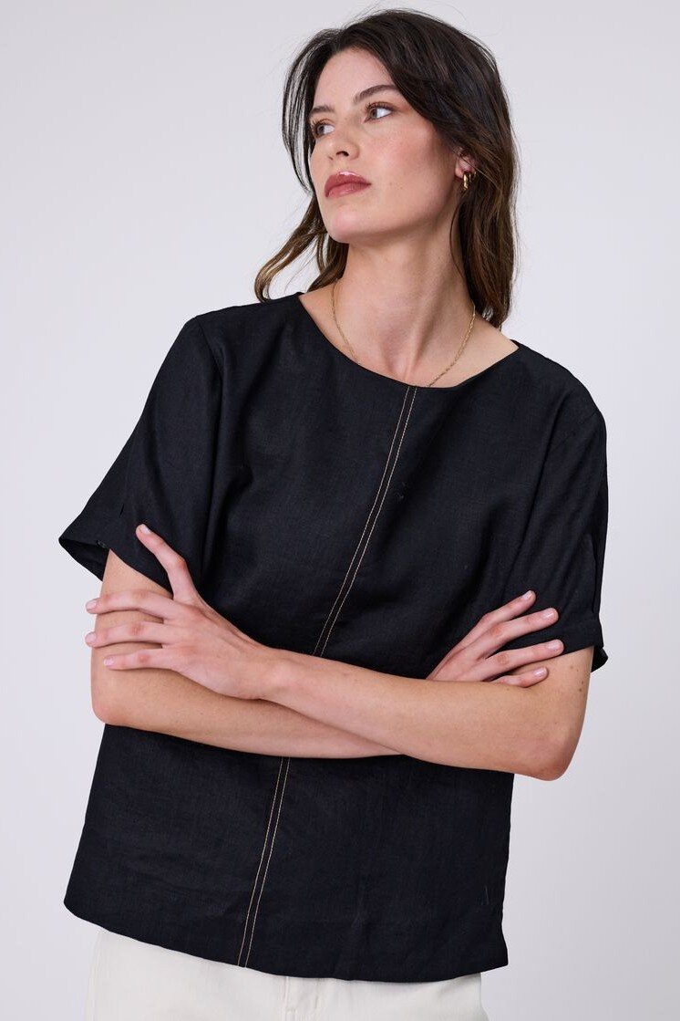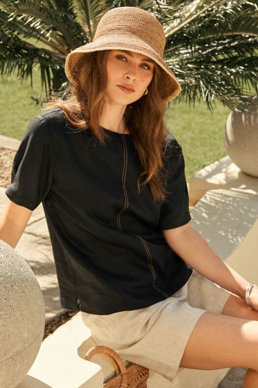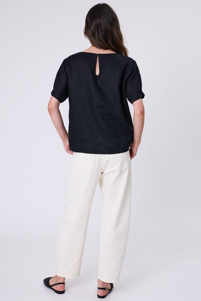 Inspired by a best-selling silhouette, reimagined for effortless summer styling. The Sable Linen Top is crafted from premium European linen-a refined, breathable fabric that feels as good as it looks. Designed with a relaxed shell shape and boat neckline, it offers an easy, flattering fit that works from day to evening. Finished with natural contrast stitching through the centre front and a keyhole button closure at the back neck, it’s a versatile piece you’ll reach for all season long