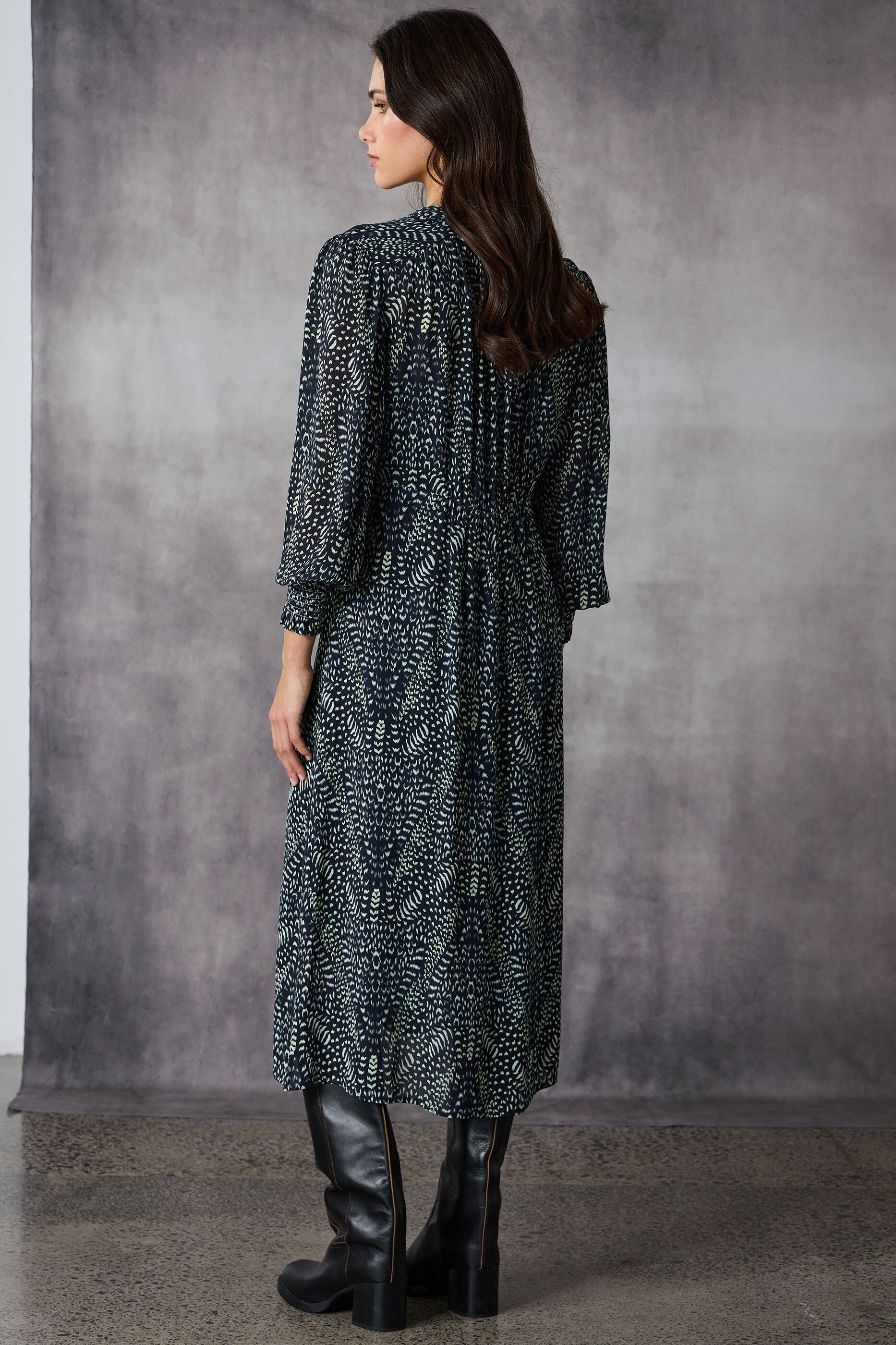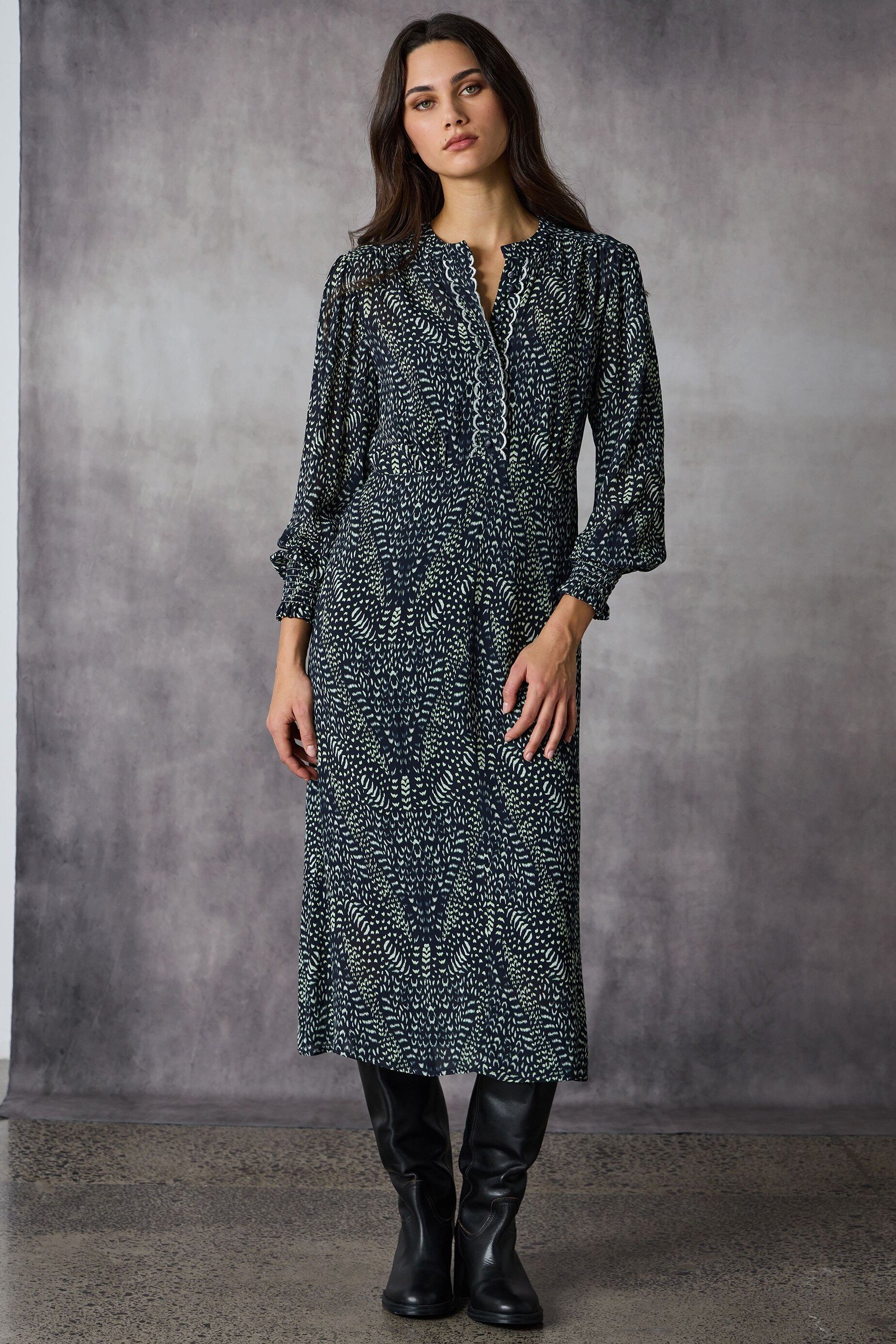 Embrace effortless elegance with the Santiago Dress, a midi-length silhouette in the Santiago Animal Print on a georgette. Scallop edge embroidery adds charm to the centre front placket, adorned with self-covered buttons. Floaty sleeves are finished with deep shirred cuffs while the elasticated back waist provides a flattering fit and all-day comfort, making it a versatile and stylish choice.