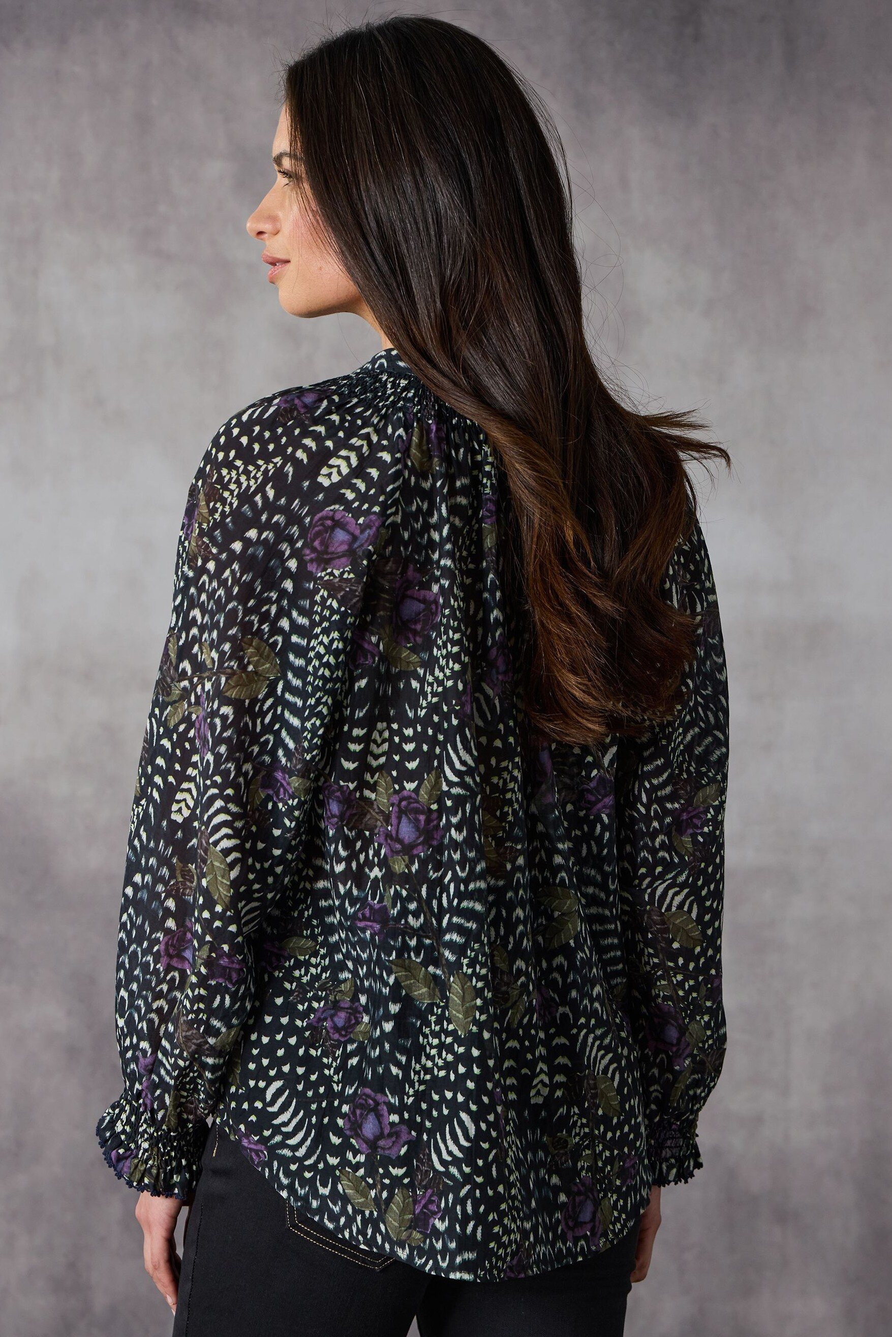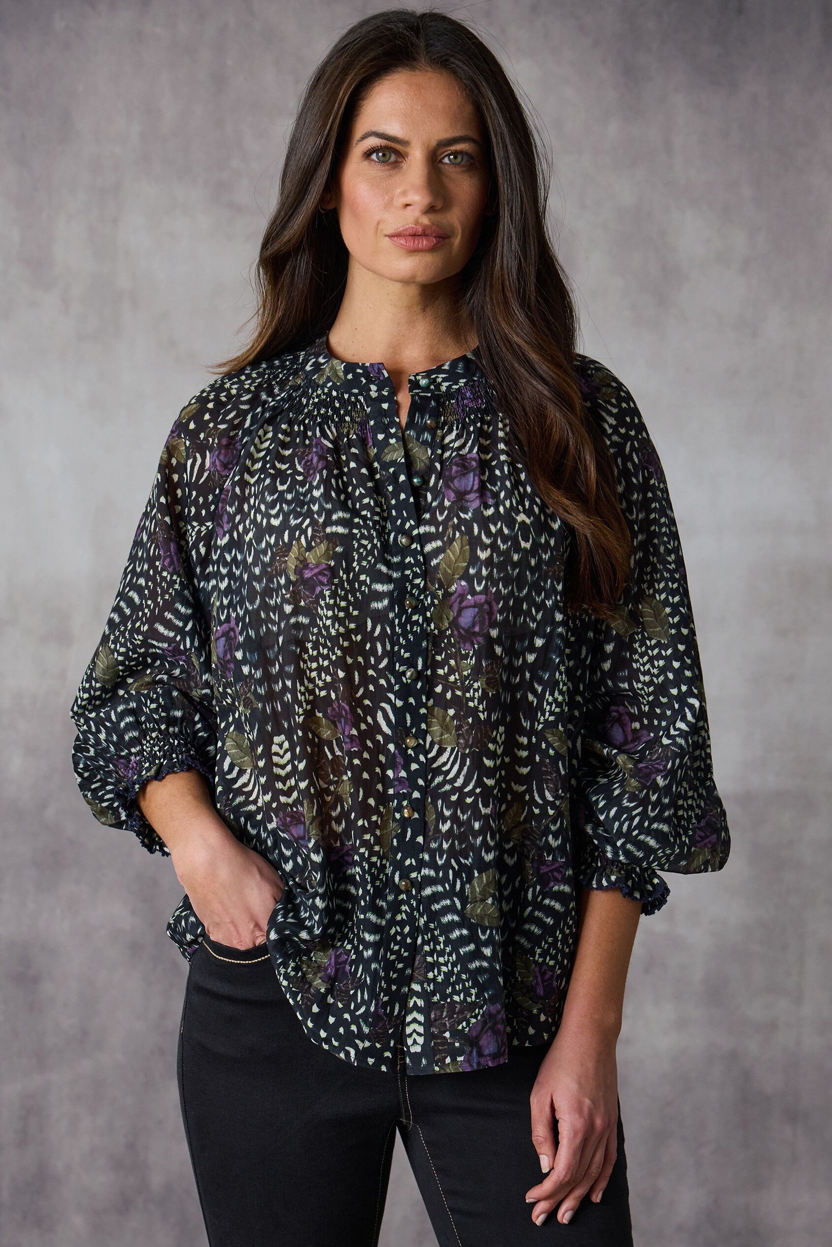 Embrace laid-back elegance with the Santiago Shirt, a relaxed fit floral printed Silk Cotton featuring button-though shirt with tonal dome glass buttons, shirred neckline, and contrast embroidery detailing on the shirred cuff. The detailing adds a feminine touch as well as allowing the print standout.