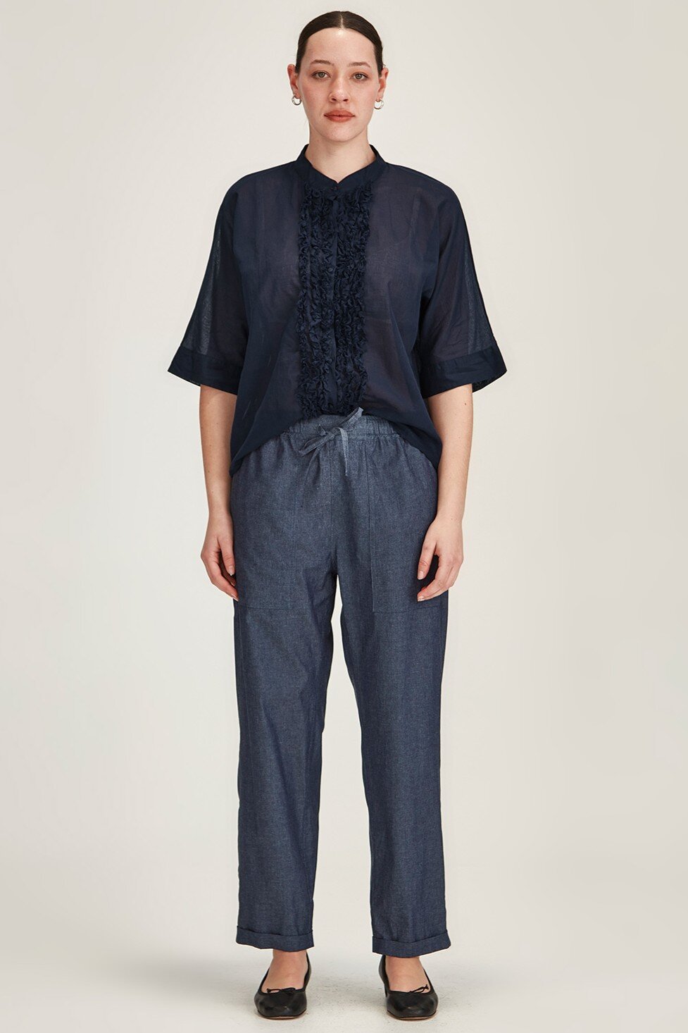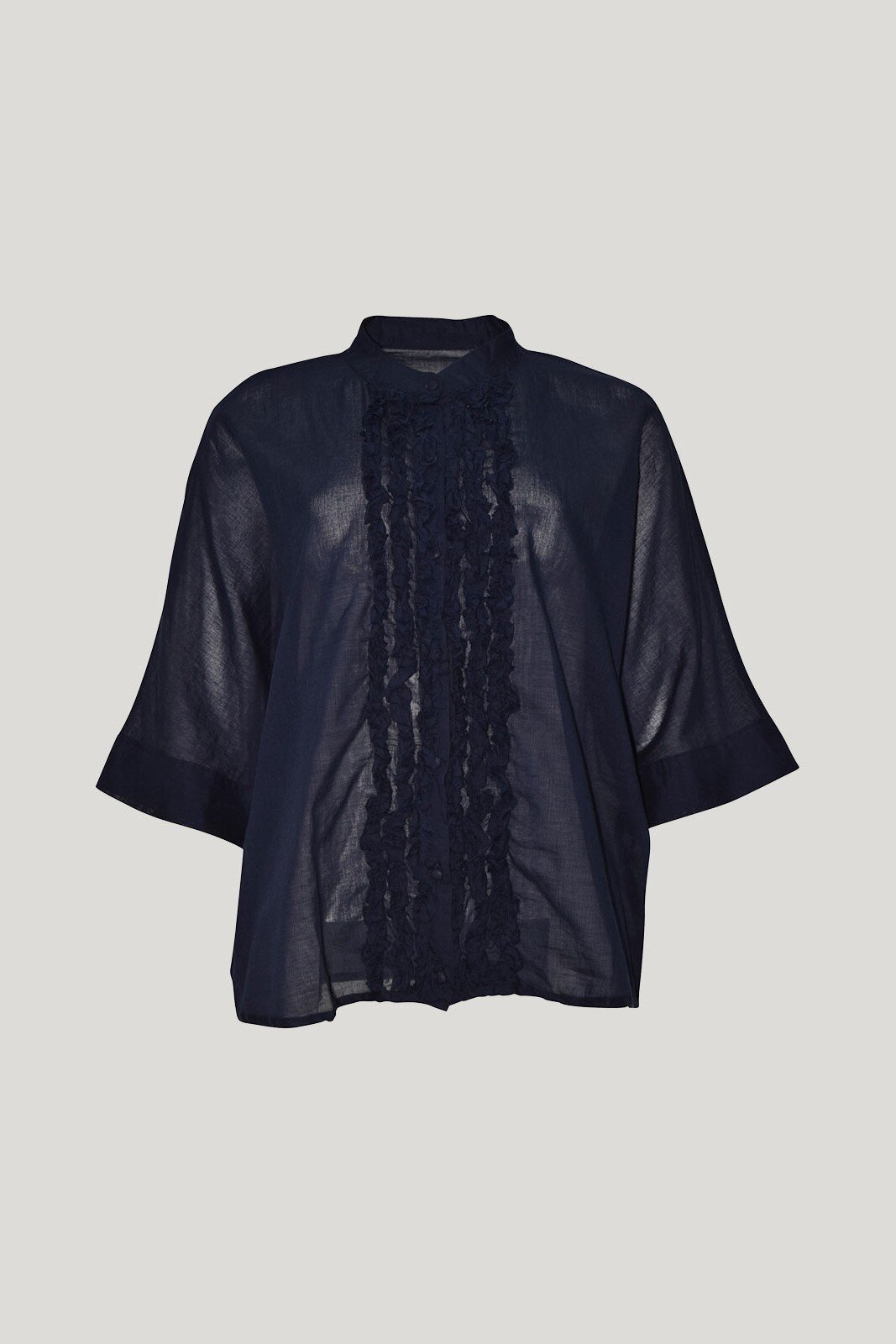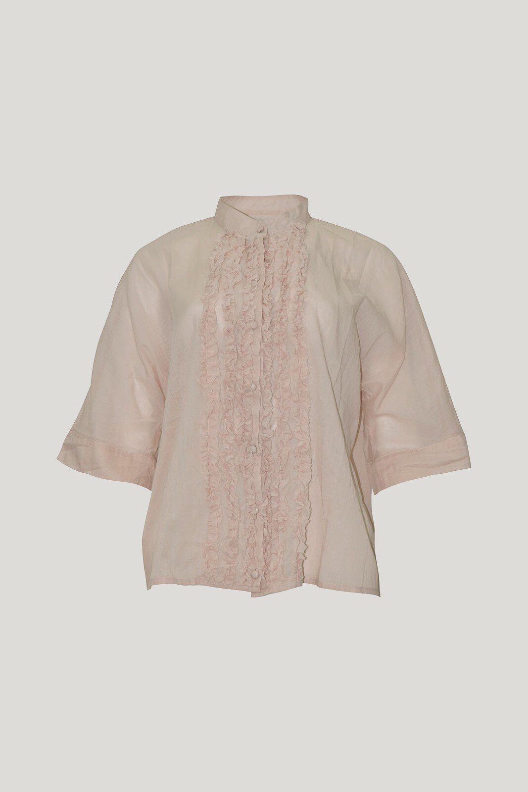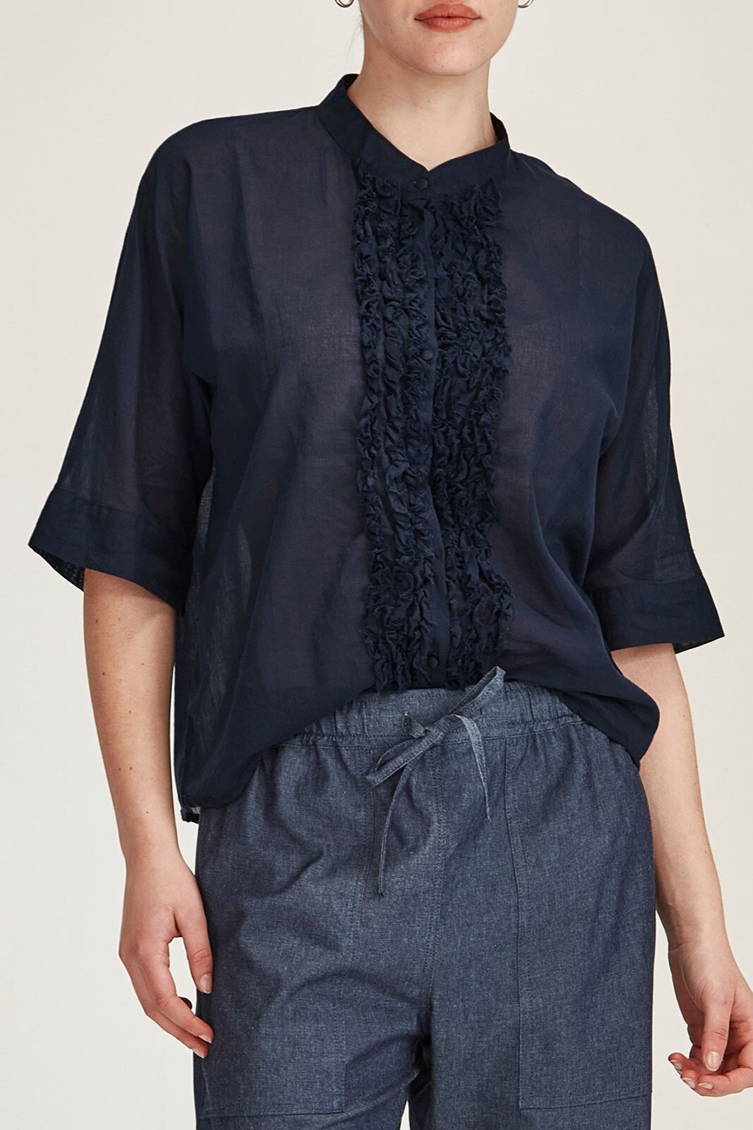 The Sasha is a boxy shape, short sleeve shirt with ruffle detailing.