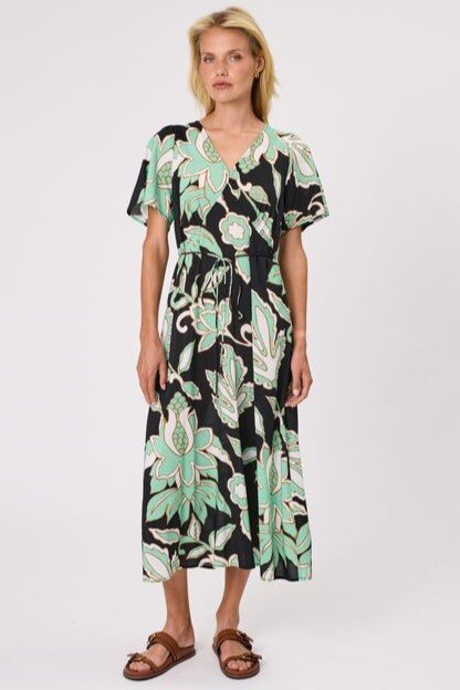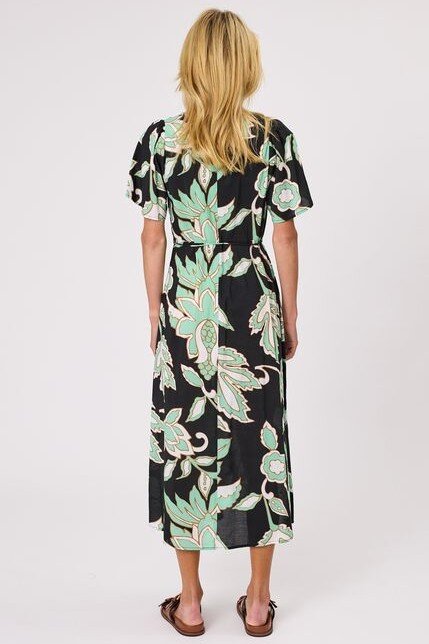 This all over Serene Print Midi Dress is made of cotton viscose. V neck opening and set in armhole with circular cut sleeves. Invisible zipper opening at left side seam. It has a separate self fabric rouleaux belt with metal ends that can be wear with or without.