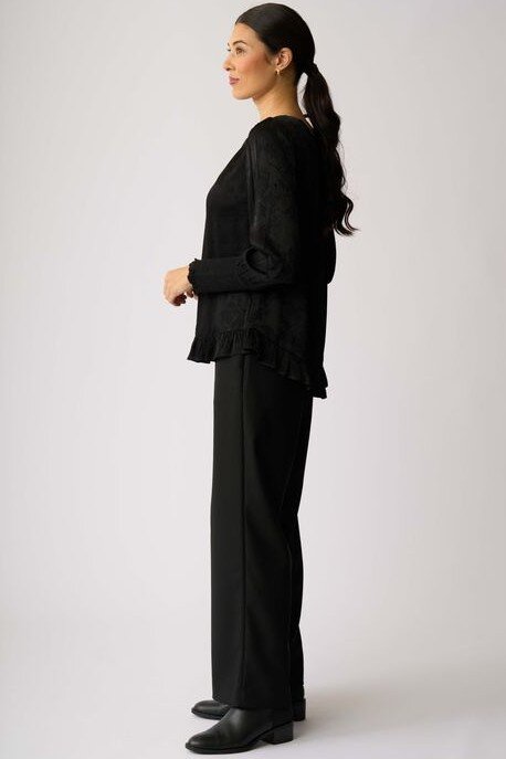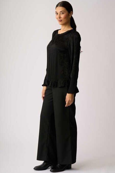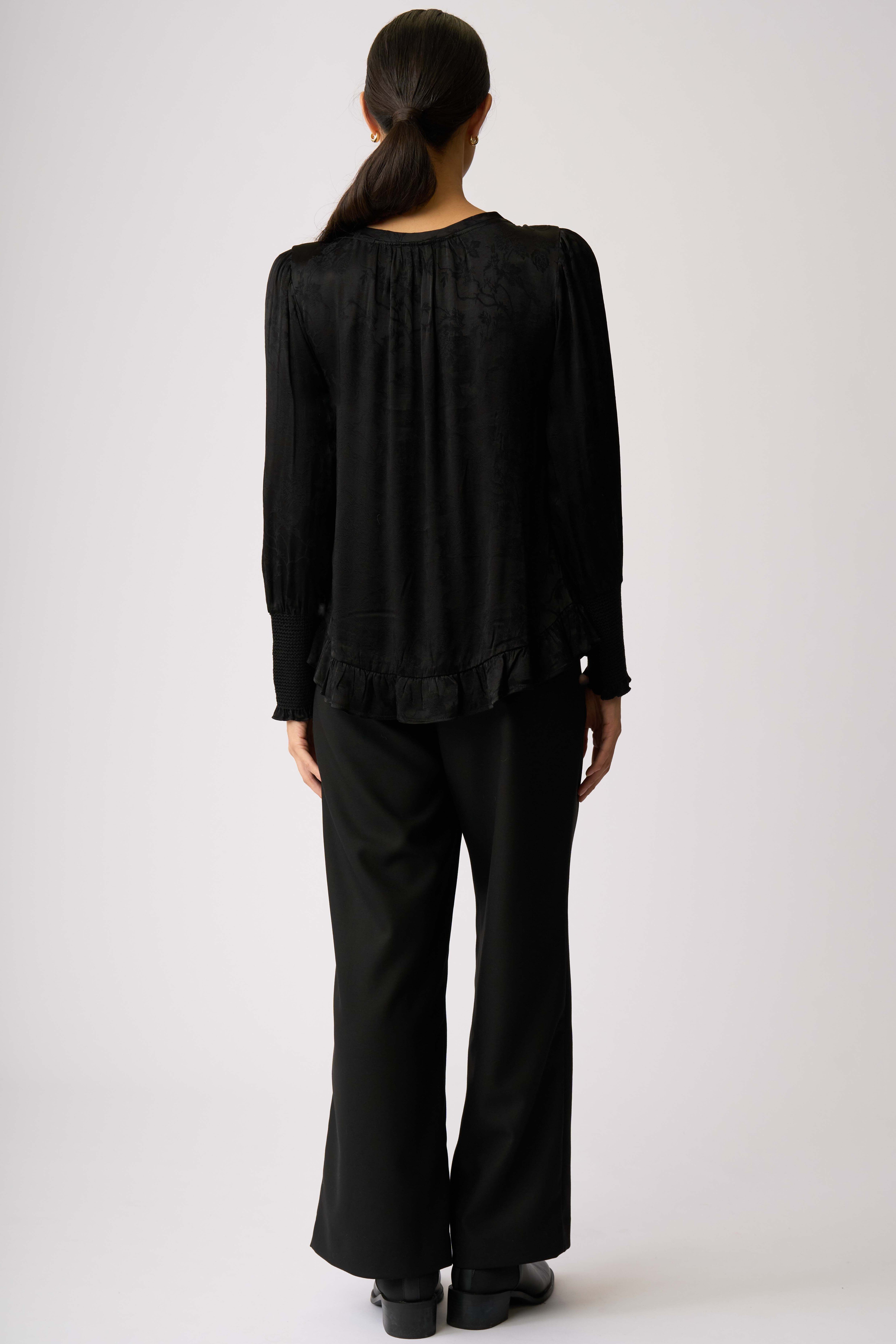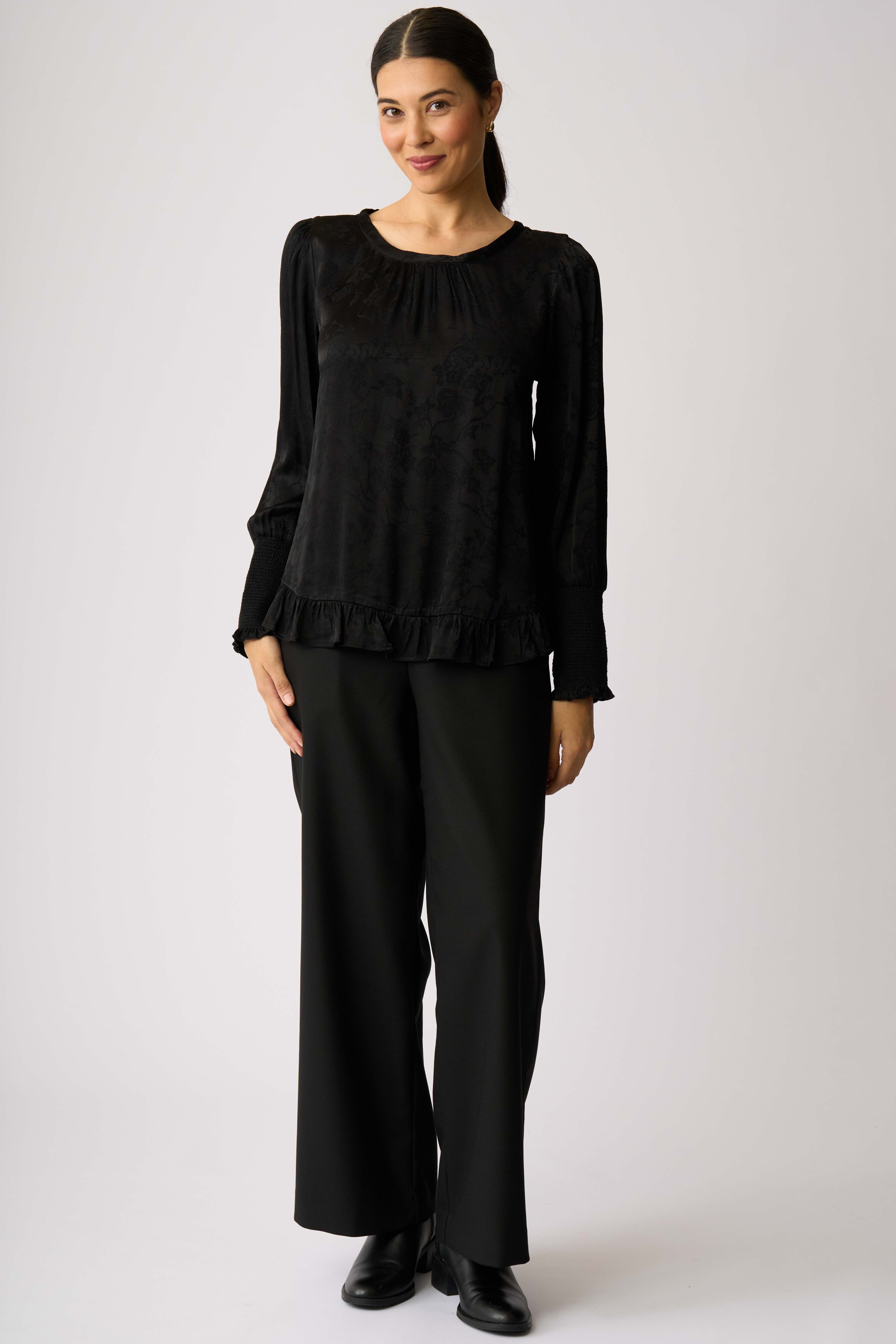 Ruffle detail, scoop hem top with full length sleeves. Featuring a long shirred elastic scuff.