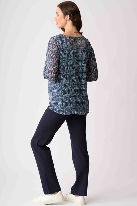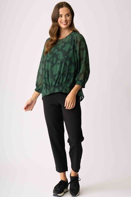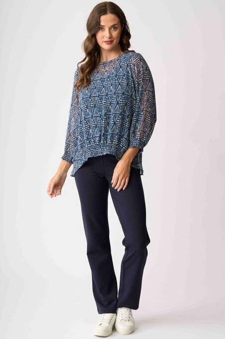 When you don't know what to pair with your favourite jeans, this is the top for you. Featuring a scoop neck. Shirring at the cuffs and a section at the front hem. The fit is relaxed and flowy.