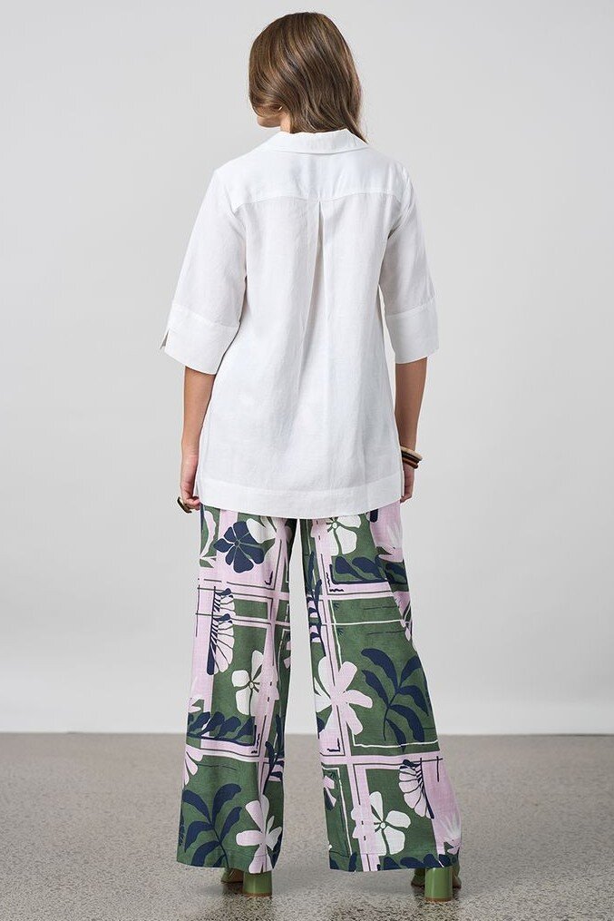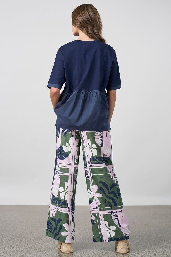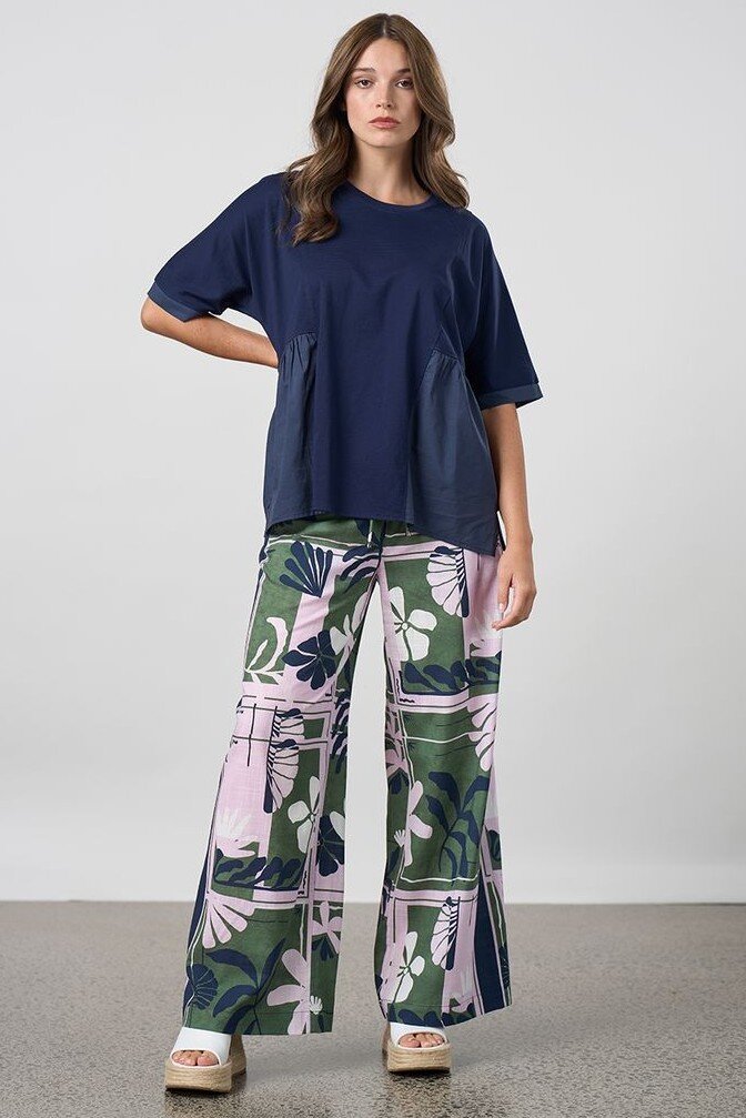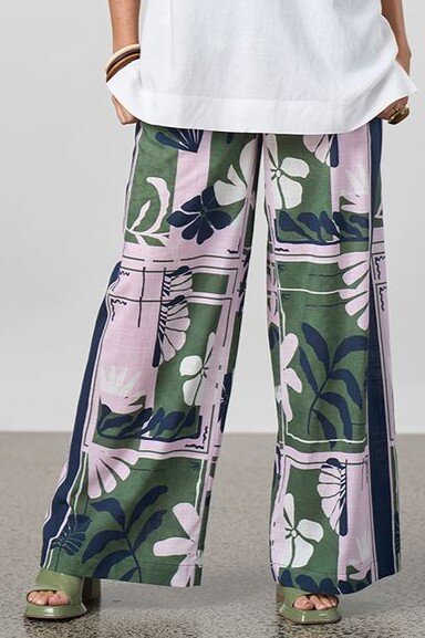 Printed, wide leg pant with a flat front and a waist tie through channel for a perfect fit. Featuring contrast side panel detailing. Functional pockets.