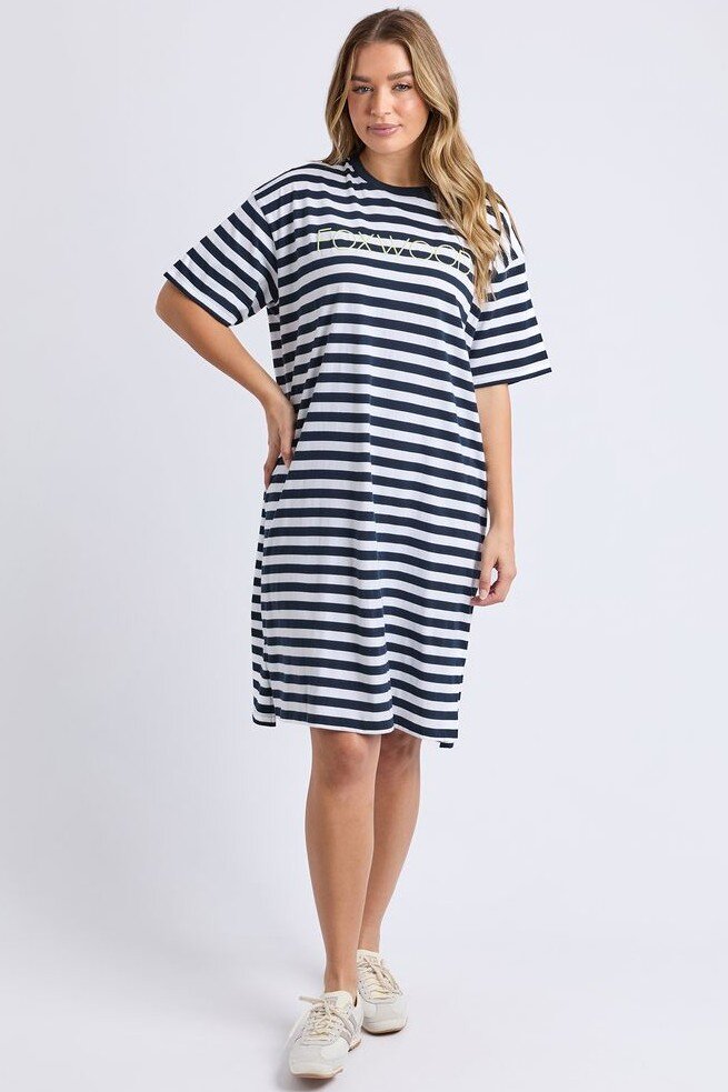 The Simplified Stripe Tee Dress brings a fresh, nautical feel to everyday dressing. Featuring bold yarn-dyed stripes, a Foxwood logo print, and a relaxed oversized fit, it’s made for comfort with a cool edge. Just add sneakers or slides for an easy-going look that’s ready for anything.