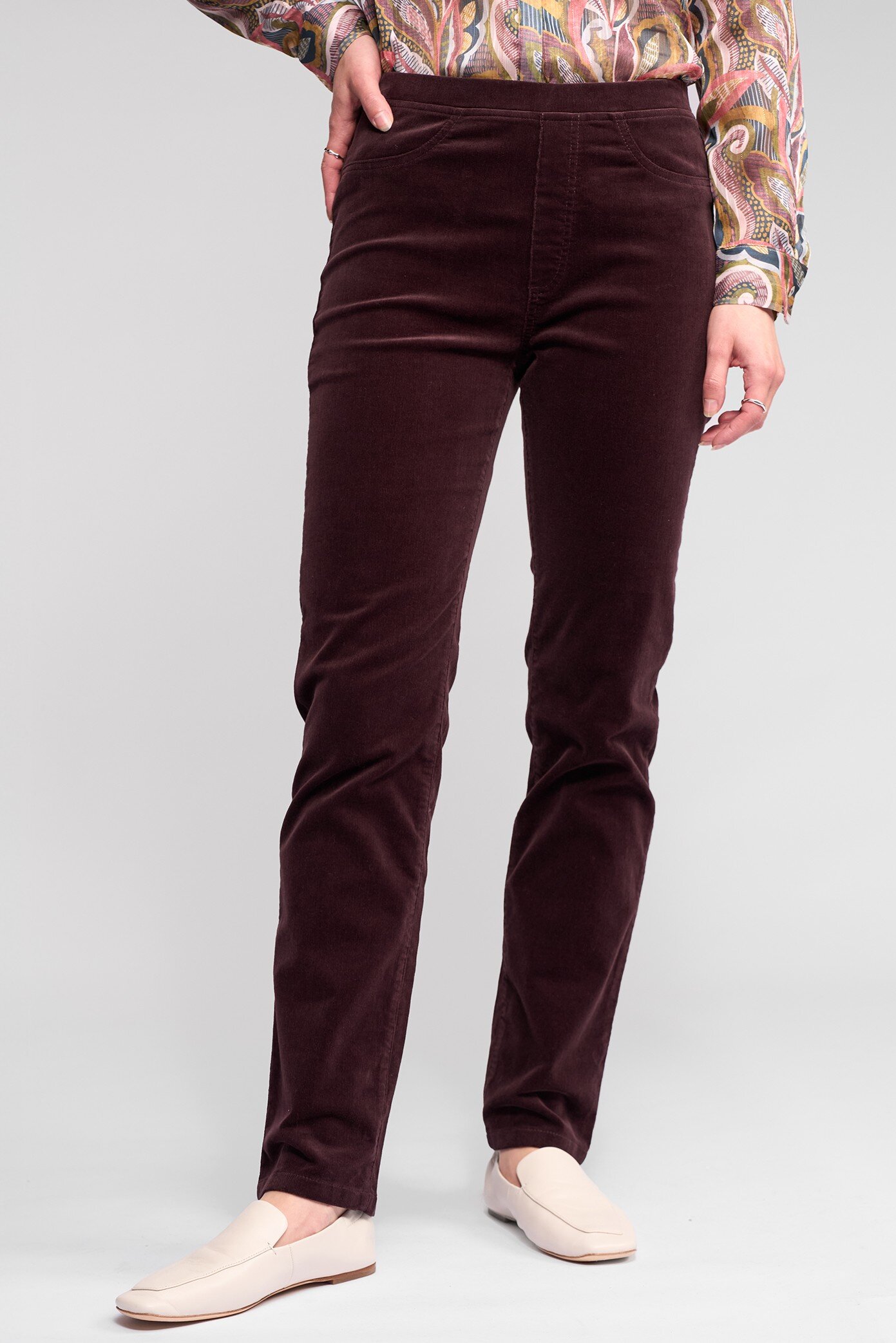 Full-length slim pant in a soft stretch pinwale cord that adds warmth and richness to any wardrobe.