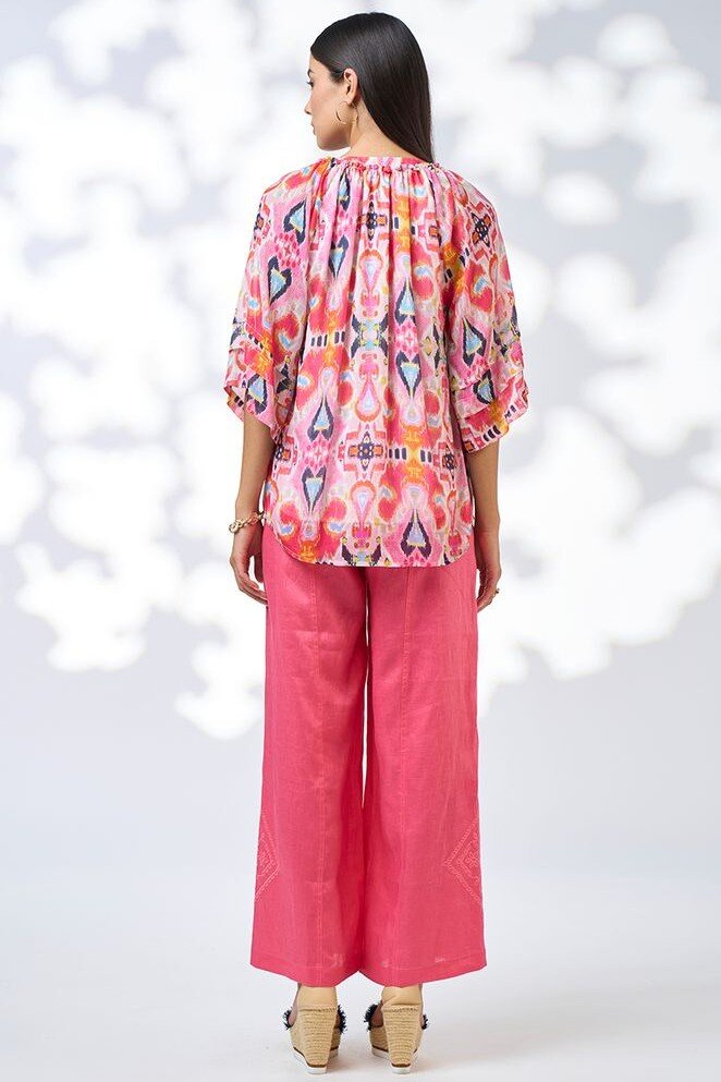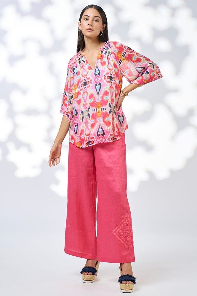 Printed floaty top with a rounded V-neckline and a layered ruffle collar, with floaty sleeves which feature lower arm tucks. Lined through body.