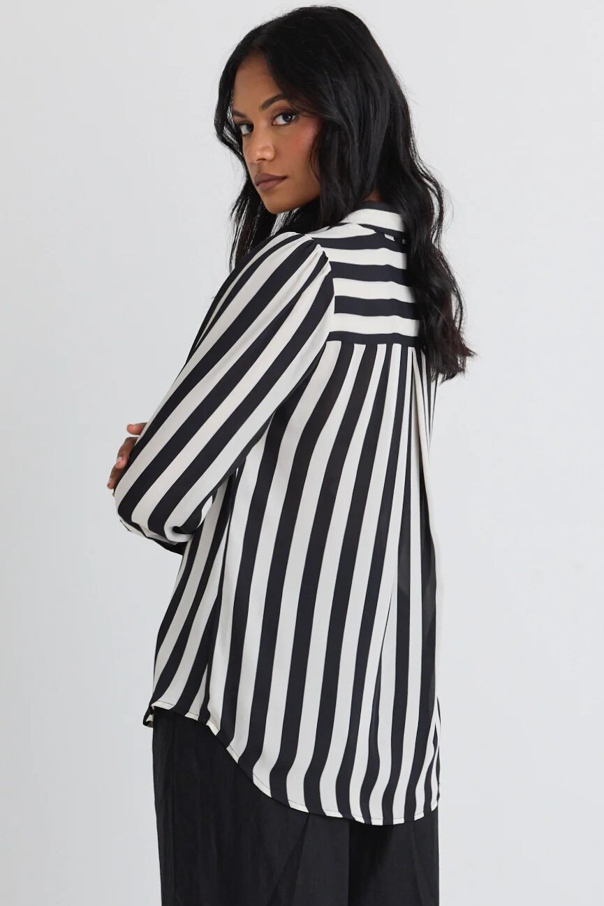 Add some stylish fun to your wardrobe with our Solidify Black White Stripe Puff Sleeve Shirt. This black and white striped shirt features trendy puff sleeve and double front pockets. Upgrade your everyday look with this statement stripe piece.