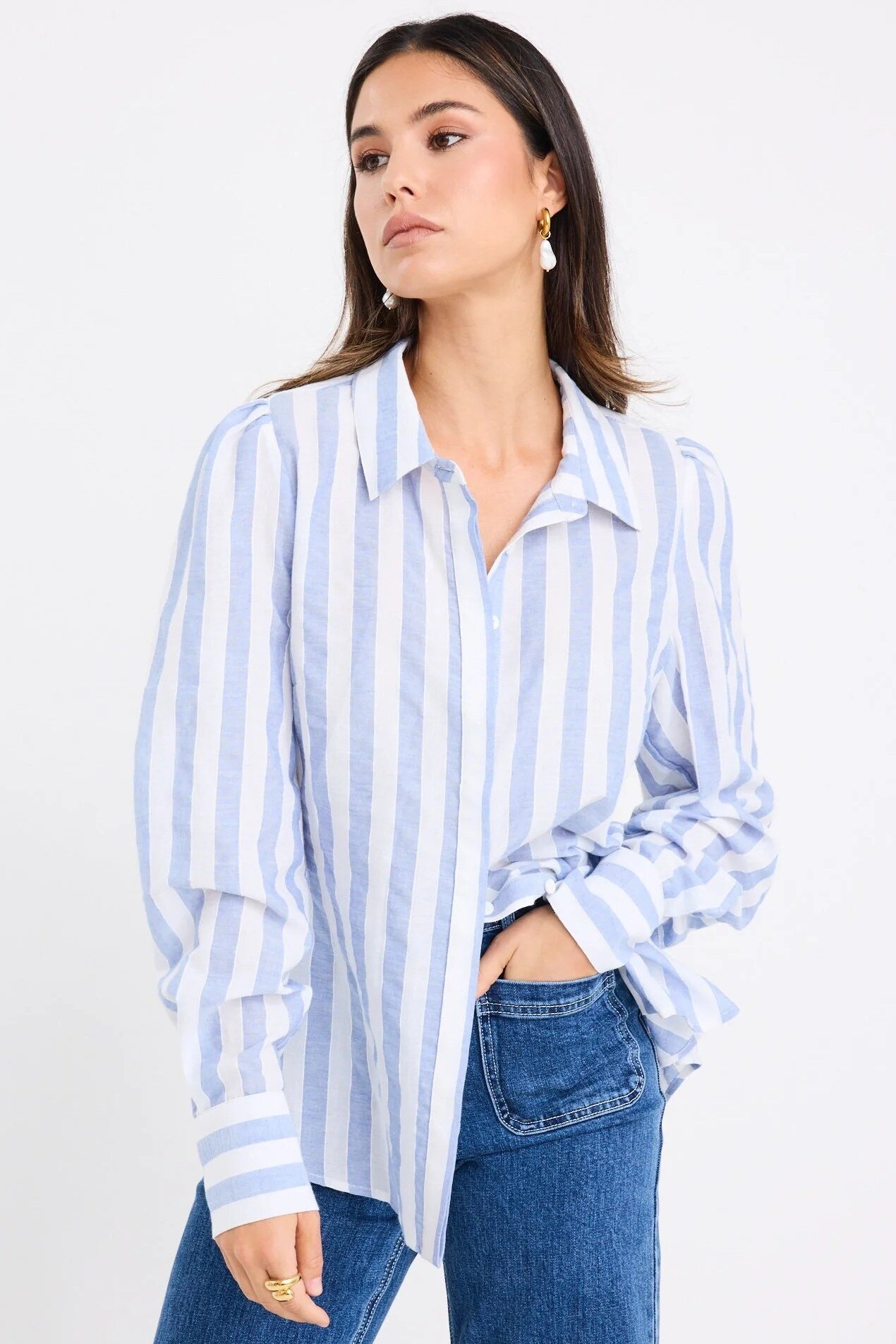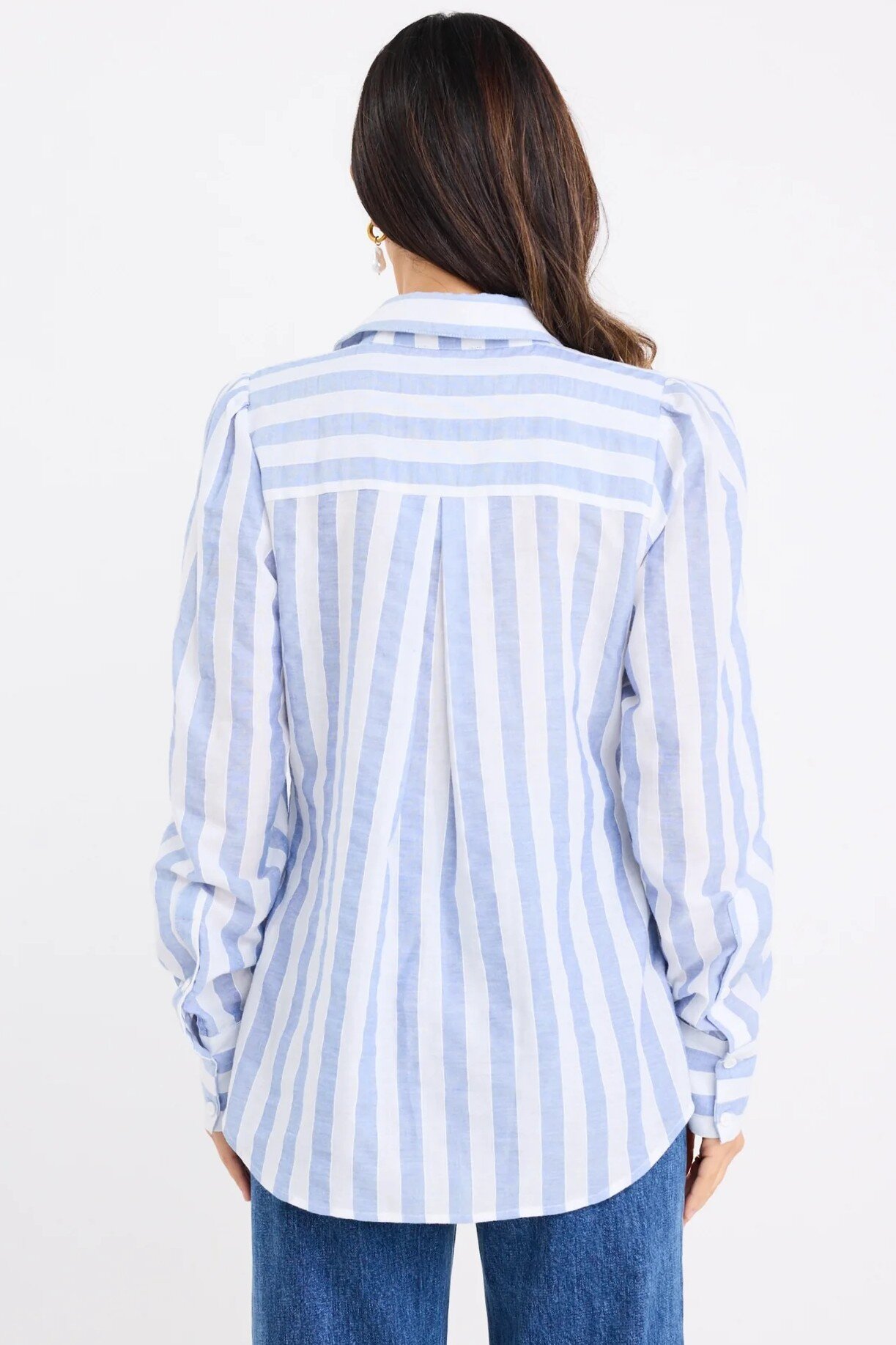 The Solidify blue stripe blouse brings effortless charm with a fresh twist. Featuring soft blue and white stripes on a breathable cotton-linen blend, it’s the kind of piece that instantly lifts your look. The billowy balloon sleeves add just the right amount of drama while keeping things floaty and feminine.