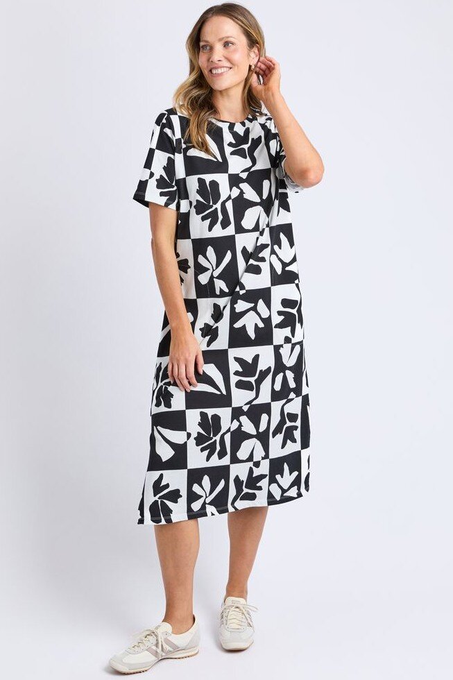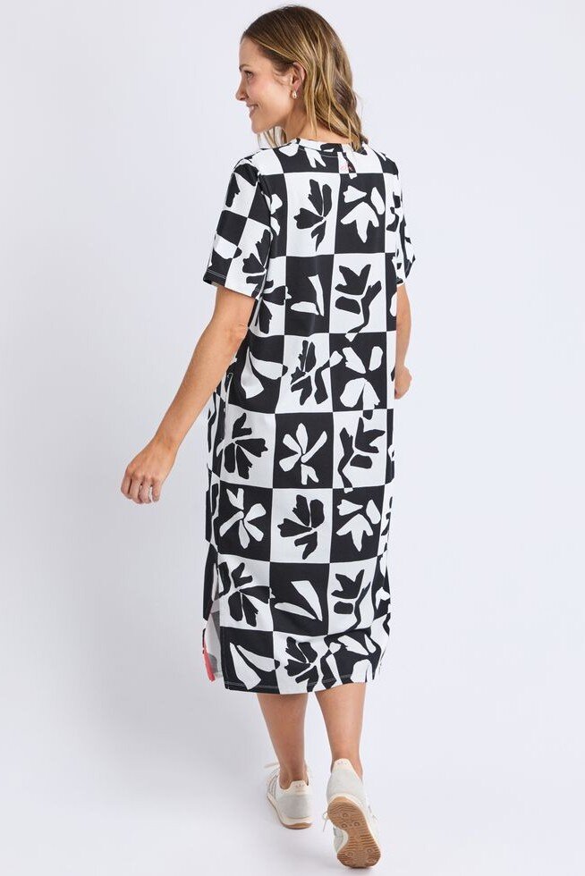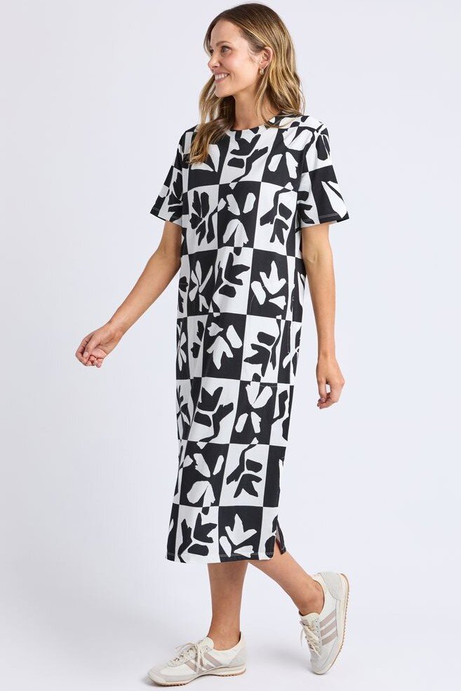 Featuring an exclusive Elm Print in timeless black and white, the Splice Dress is an effortless piece for everyday wear.
