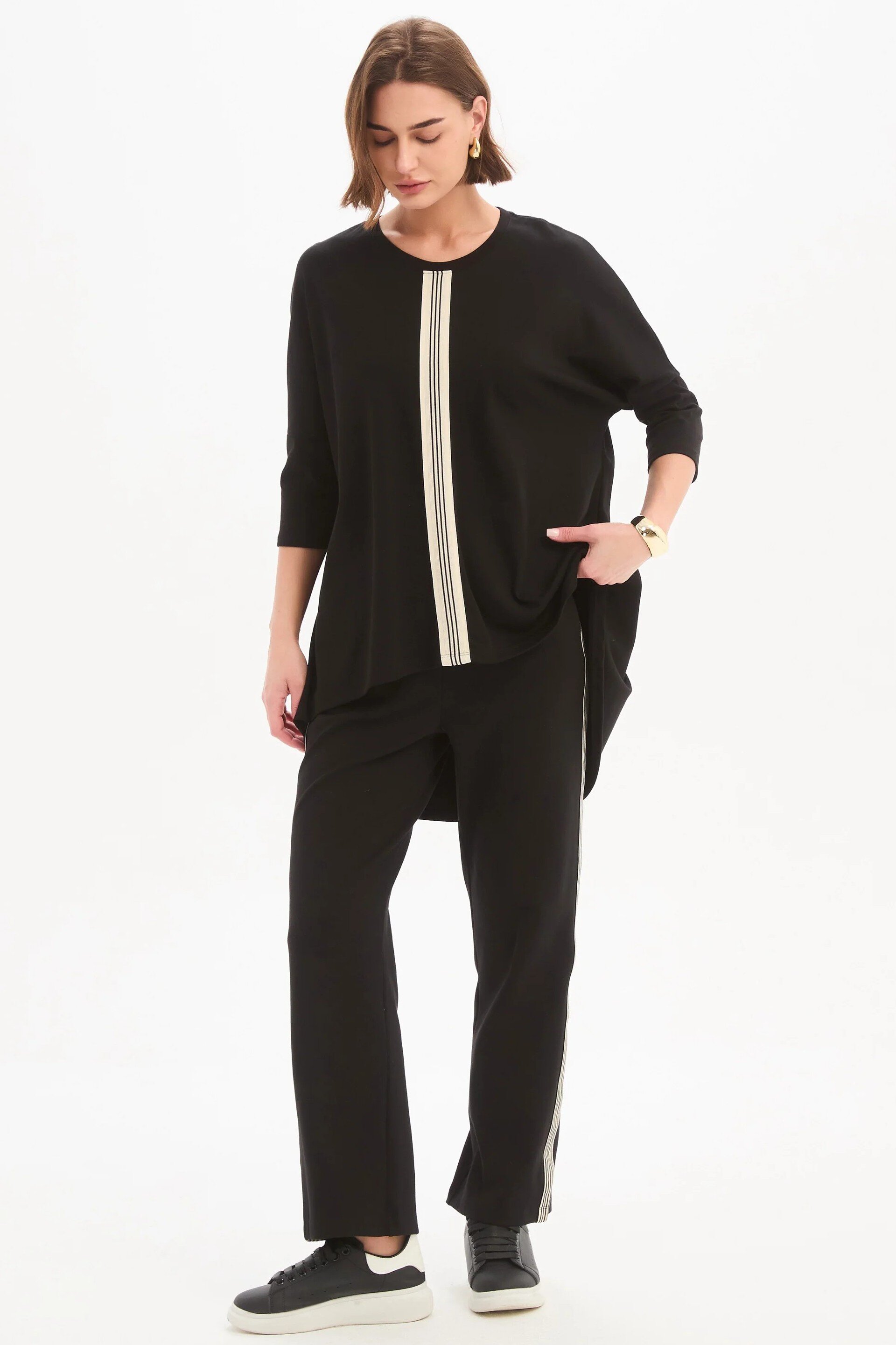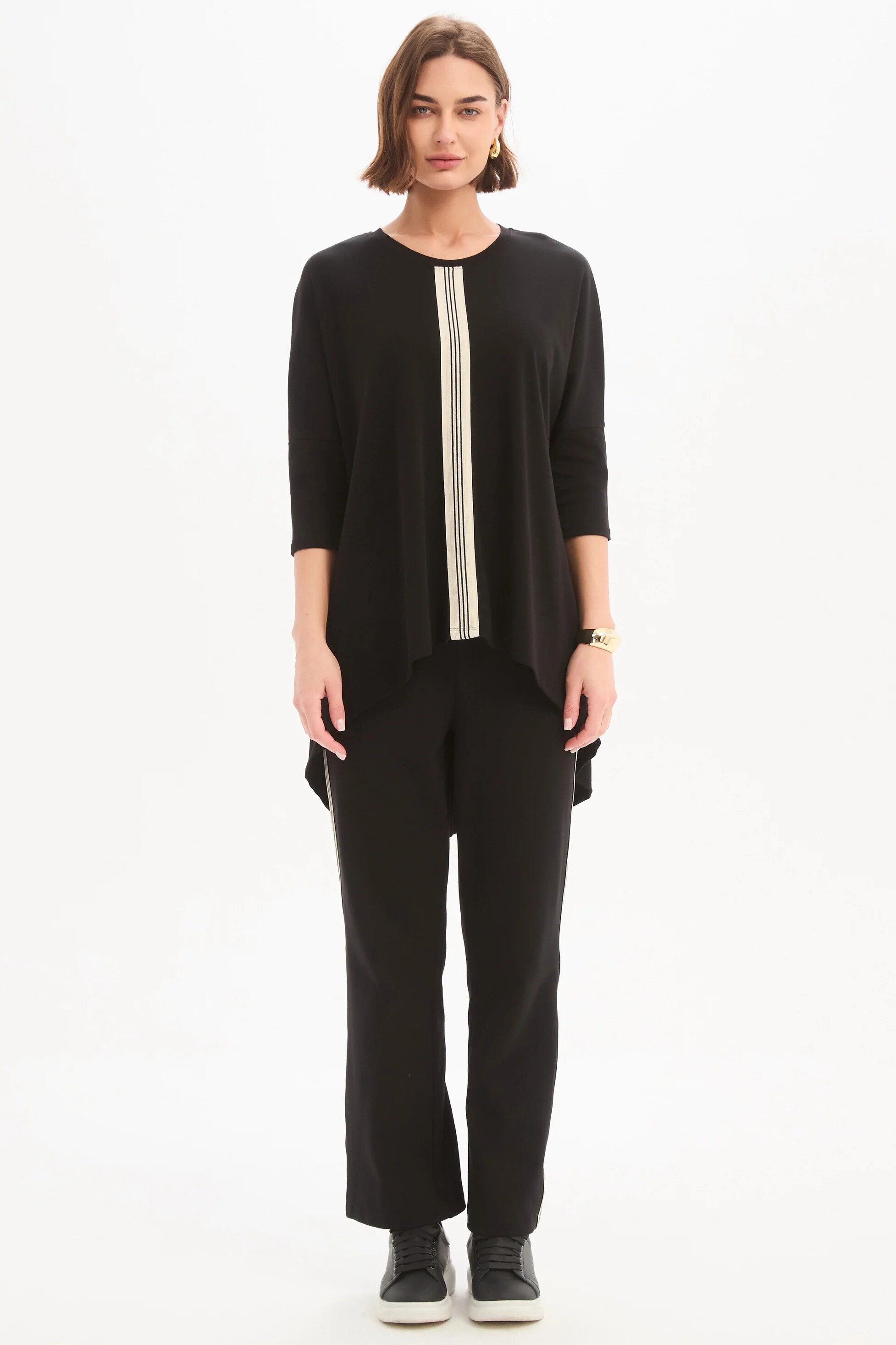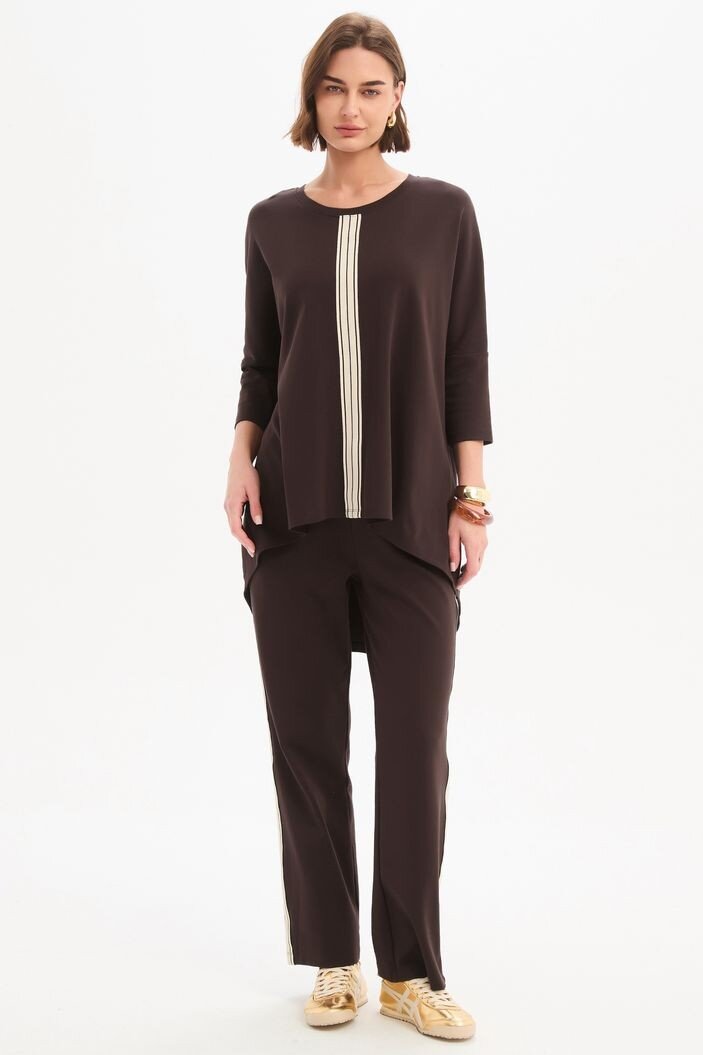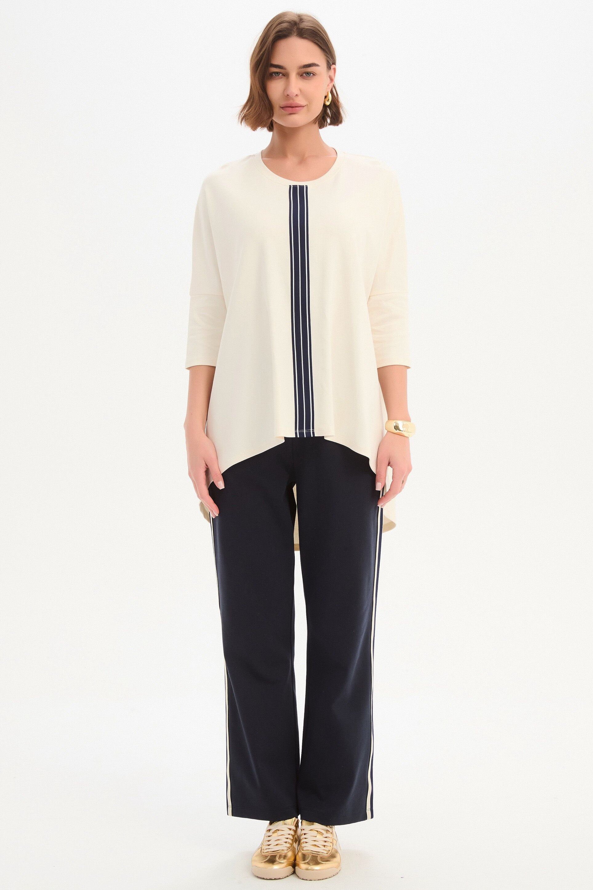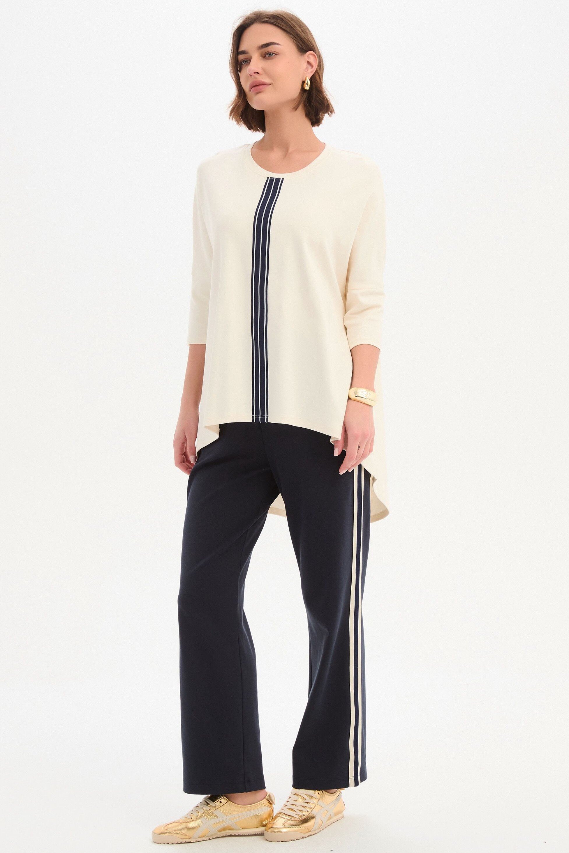 An elevated essential with a considered edge. Crafted from quality cotton jersey, the Stripe Front 3/4 Sleeve Tee features a clean silhouette accented by a bold striped tape detail, balanced by 3/4 sleeves and a subtle high-low hem. An easy, modern piece designed to bring quiet interest to your everyday rotation.