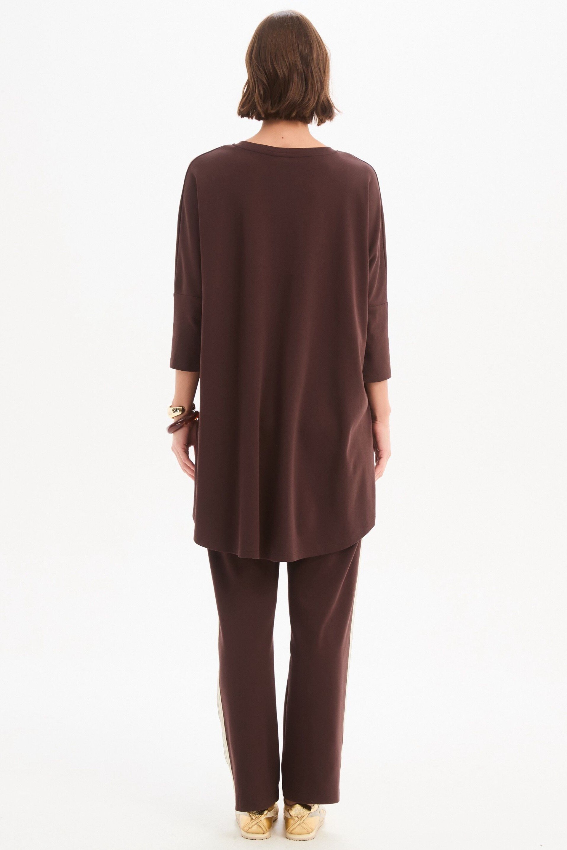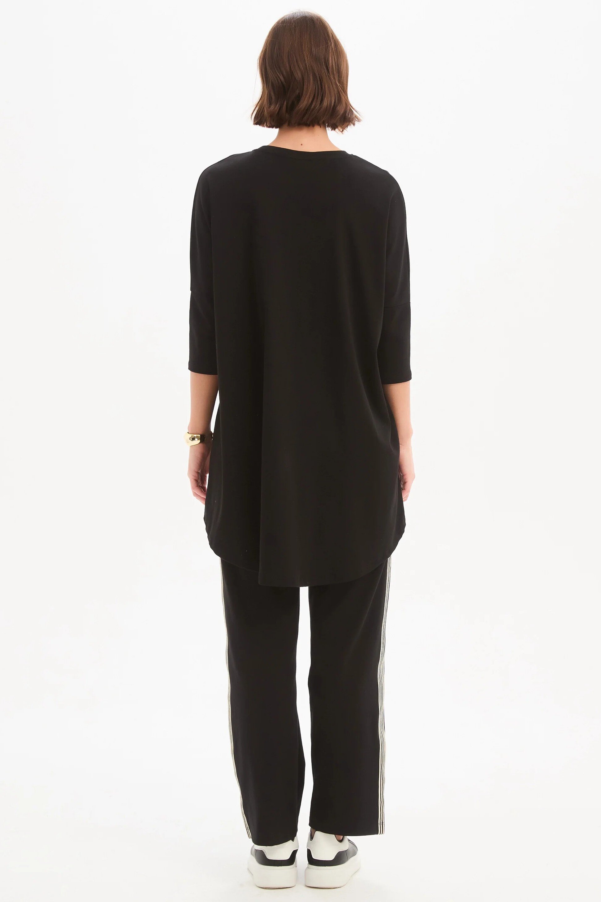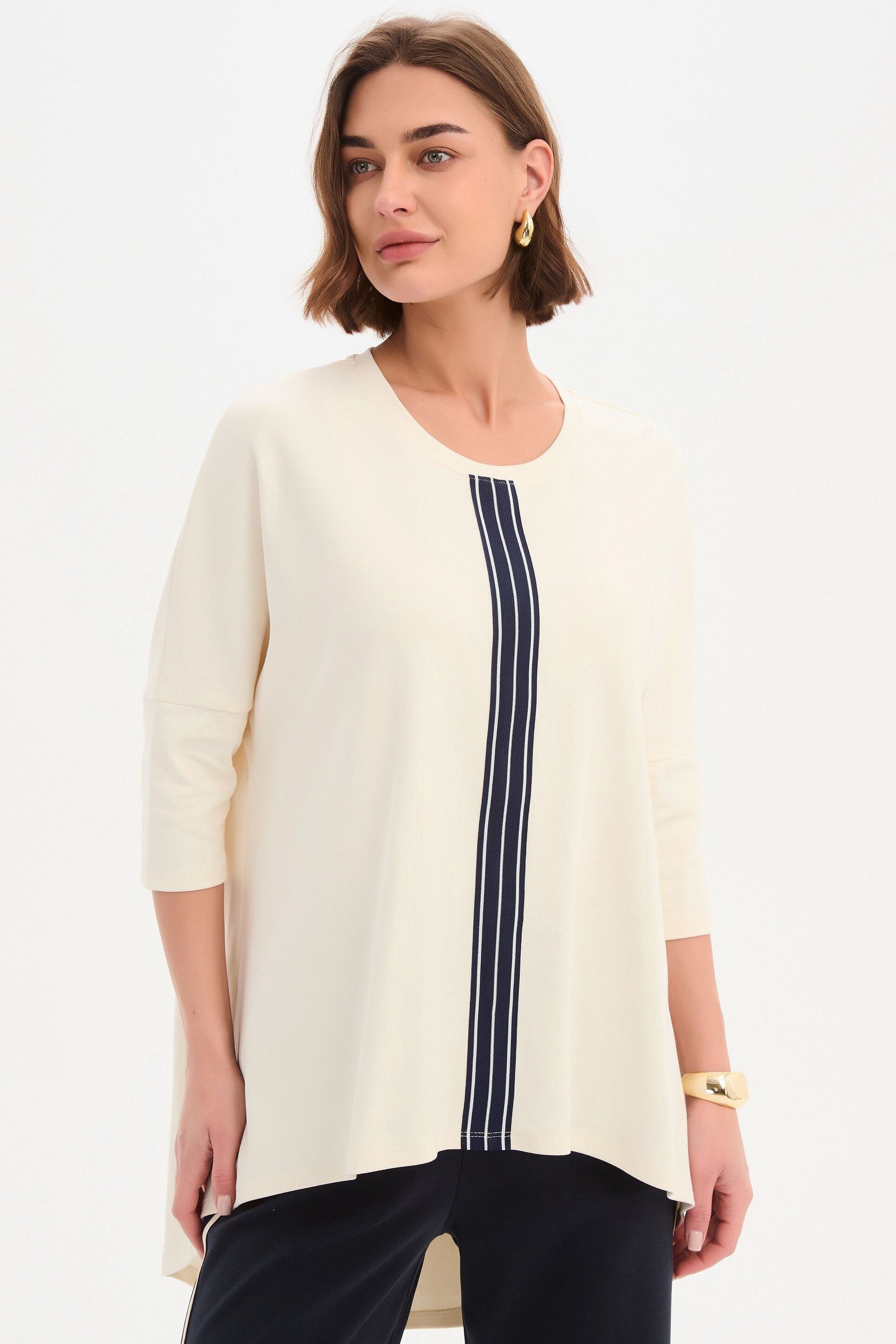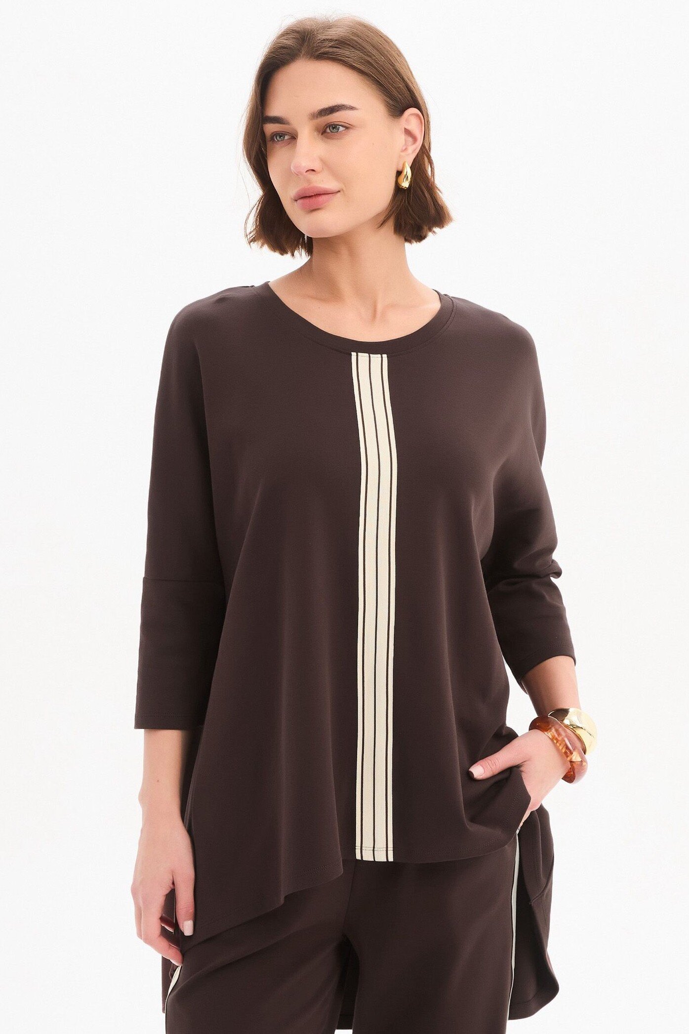 An elevated essential with a considered edge. Crafted from quality cotton jersey, the Stripe Front 3/4 Sleeve Tee features a clean silhouette accented by a bold striped tape detail, balanced by 3/4 sleeves and a subtle high-low hem. An easy, modern piece designed to bring quiet interest to your everyday rotation.