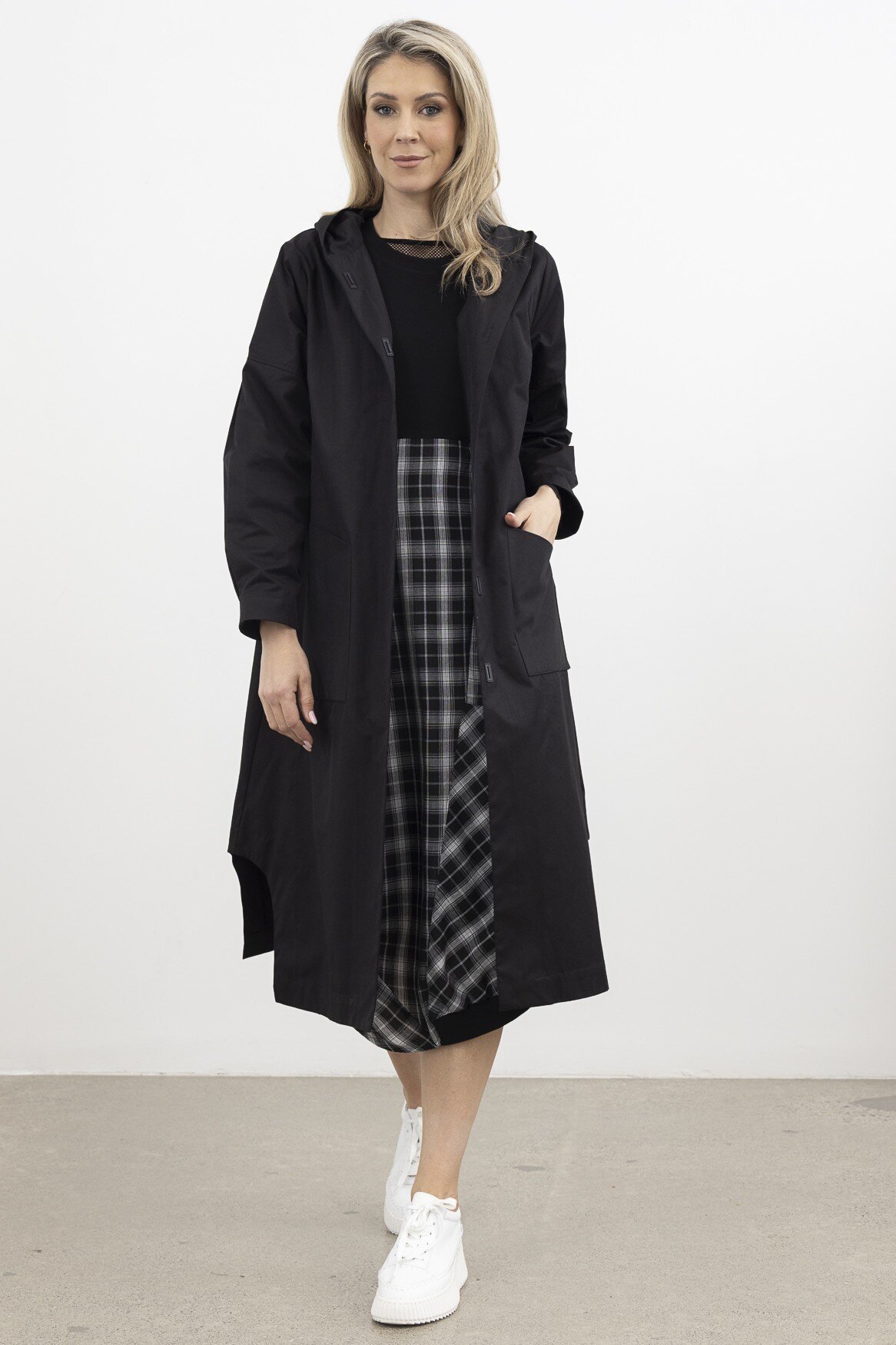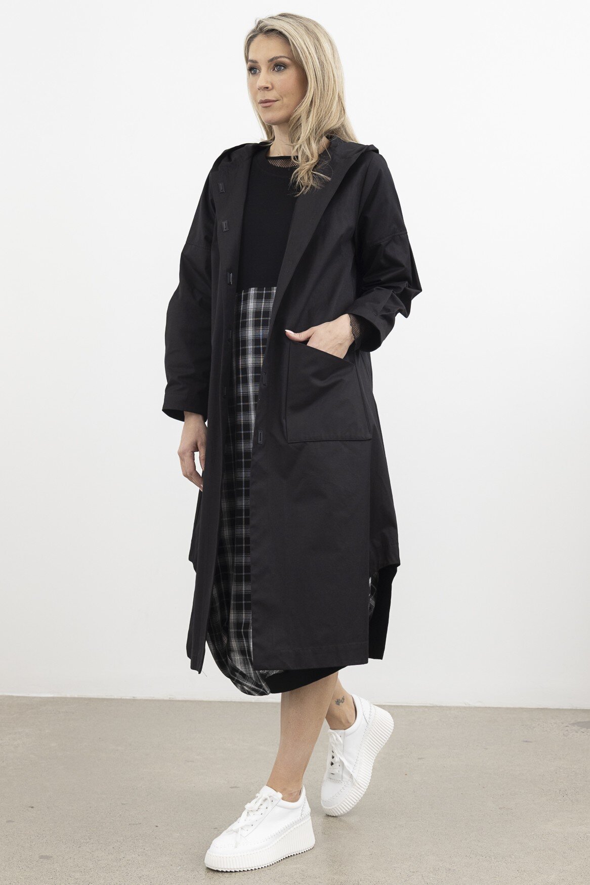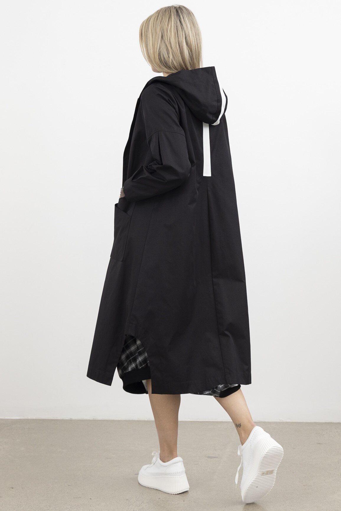 A modern reimagining of the classic trench, the Subconscious Trench Coat features a structured hood, oversized patch pockets, and a statement back stripe. With a relaxed yet architectural silhouette and minimal hardware, it offers a refined, utilitarian edge to trans-seasonal layering.