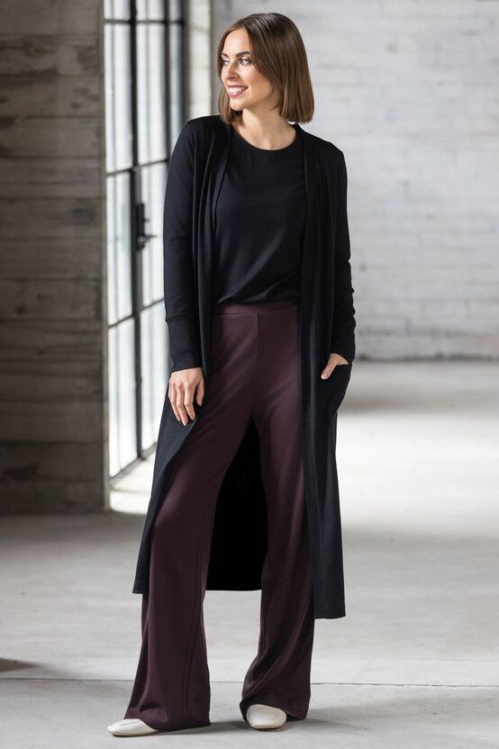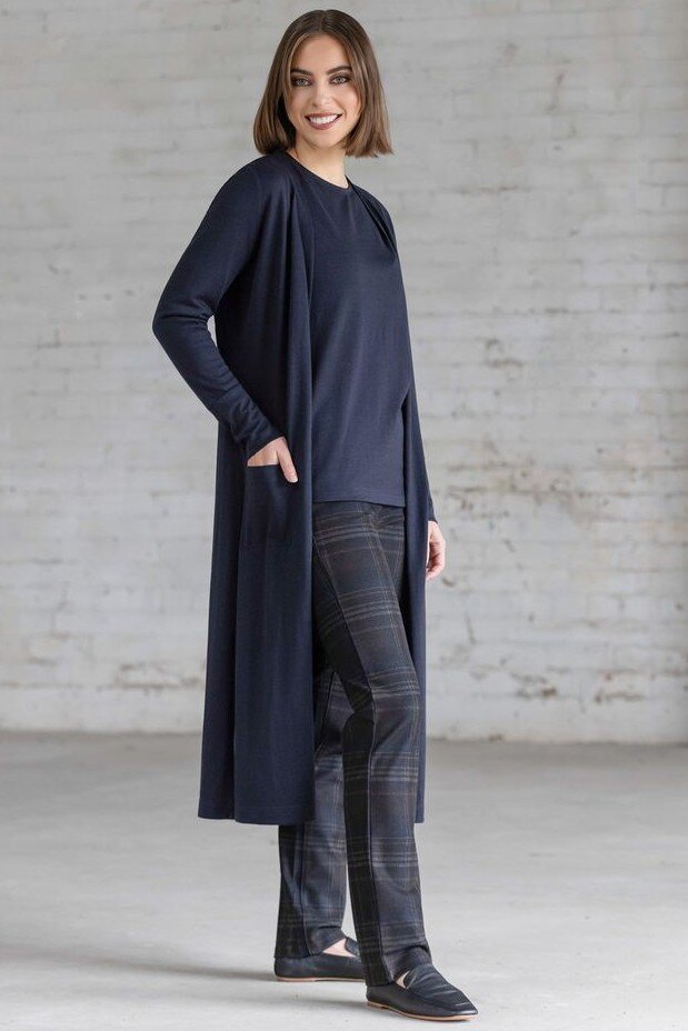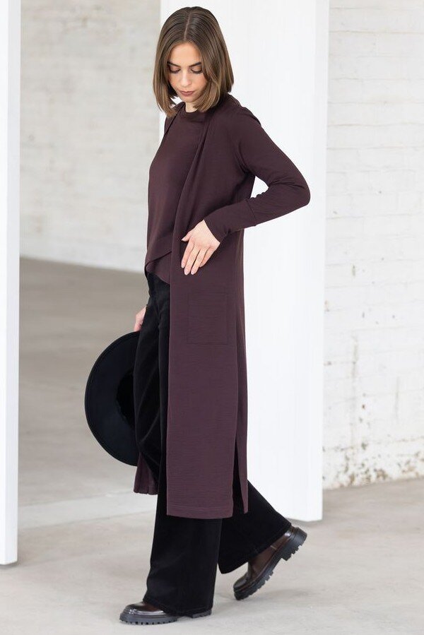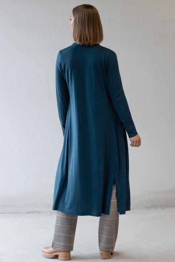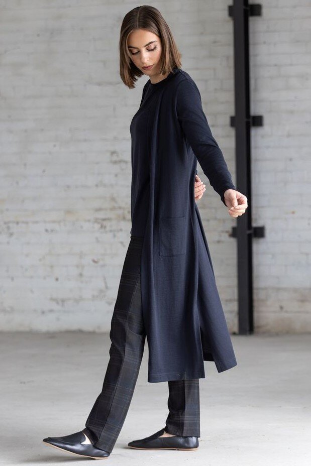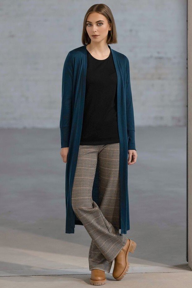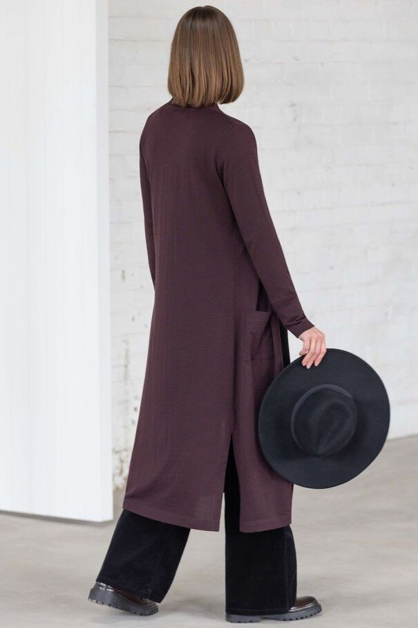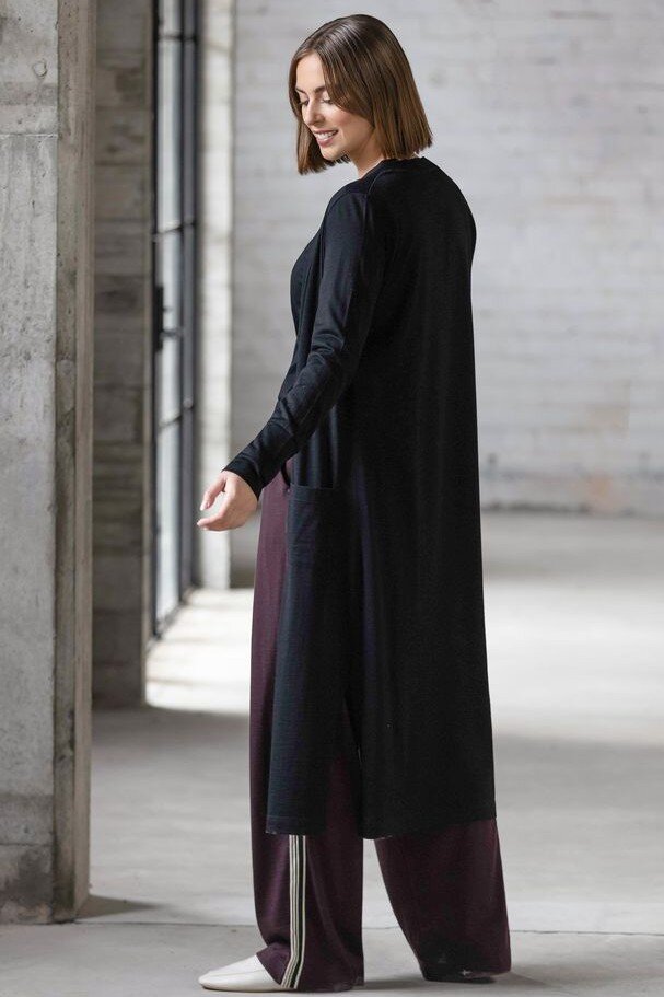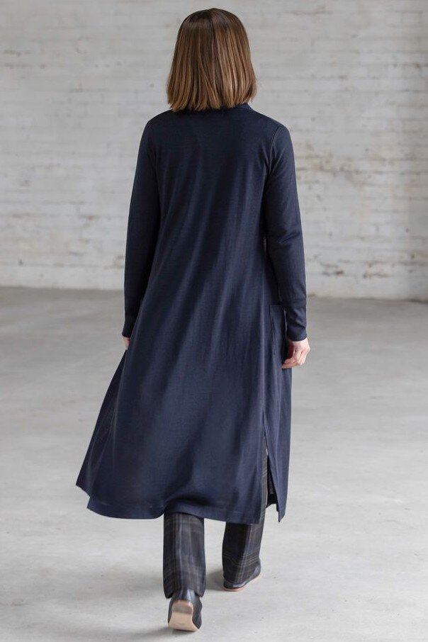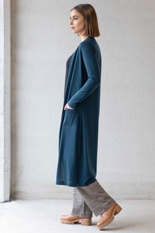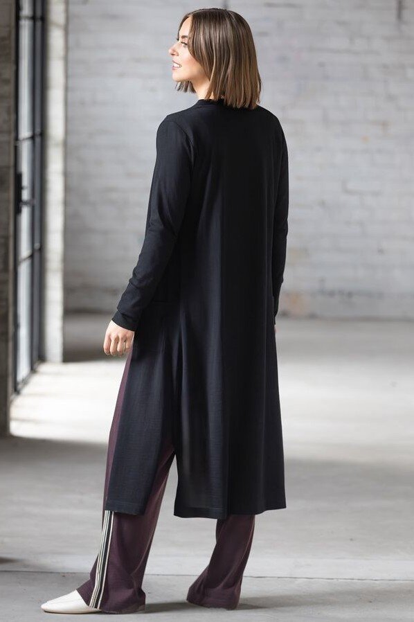 Long merino coatigan. Designed with an open front and a slim, streamlined fit, this style offers an easy layering piece that provides warmth without bulk.