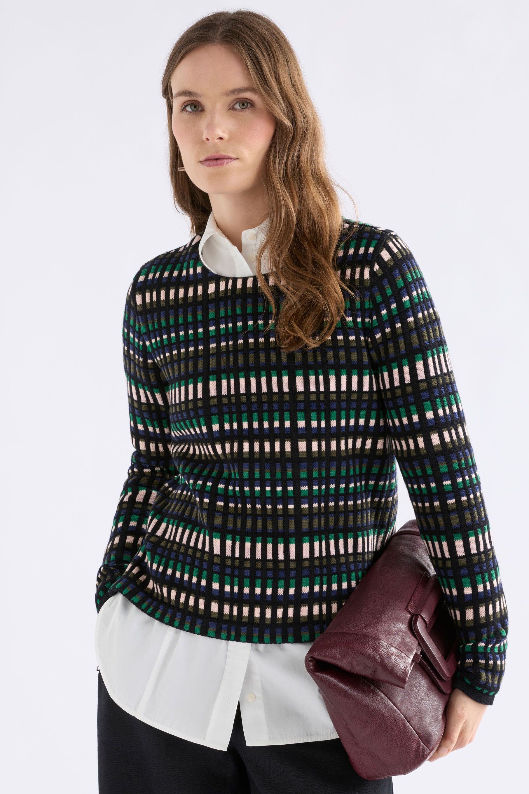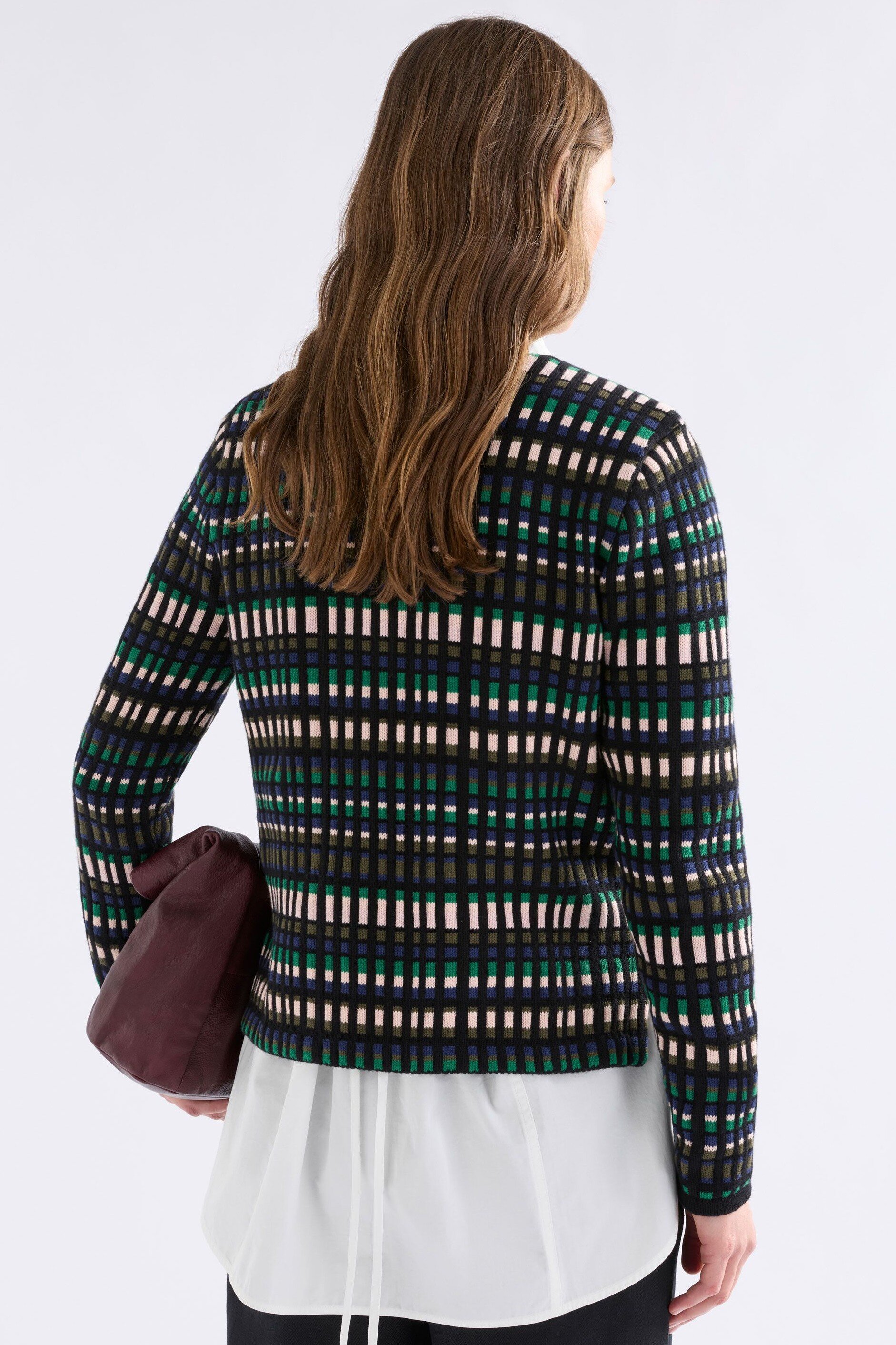 The Svea Organic Knit Sweater is a striking knitted pull-over, crafted from a soft organic cotton. This regular fit style features a crew-boat neckline, long set-in sleeves, and a mid-gauge knit construction in a graphical check pattern of steel blue, verdant green, cream and black. An ELK favourite shape with a streamlined slim silhouette and stretch from the knitted construction. A versatile sweater that pairs with the matching Svea Organic Knit Skirt for a fun statement look, or tailored trousers or denim for everyday wear when you want to add a pop of colour to your autumn-winter looks.