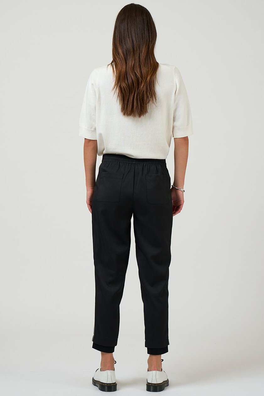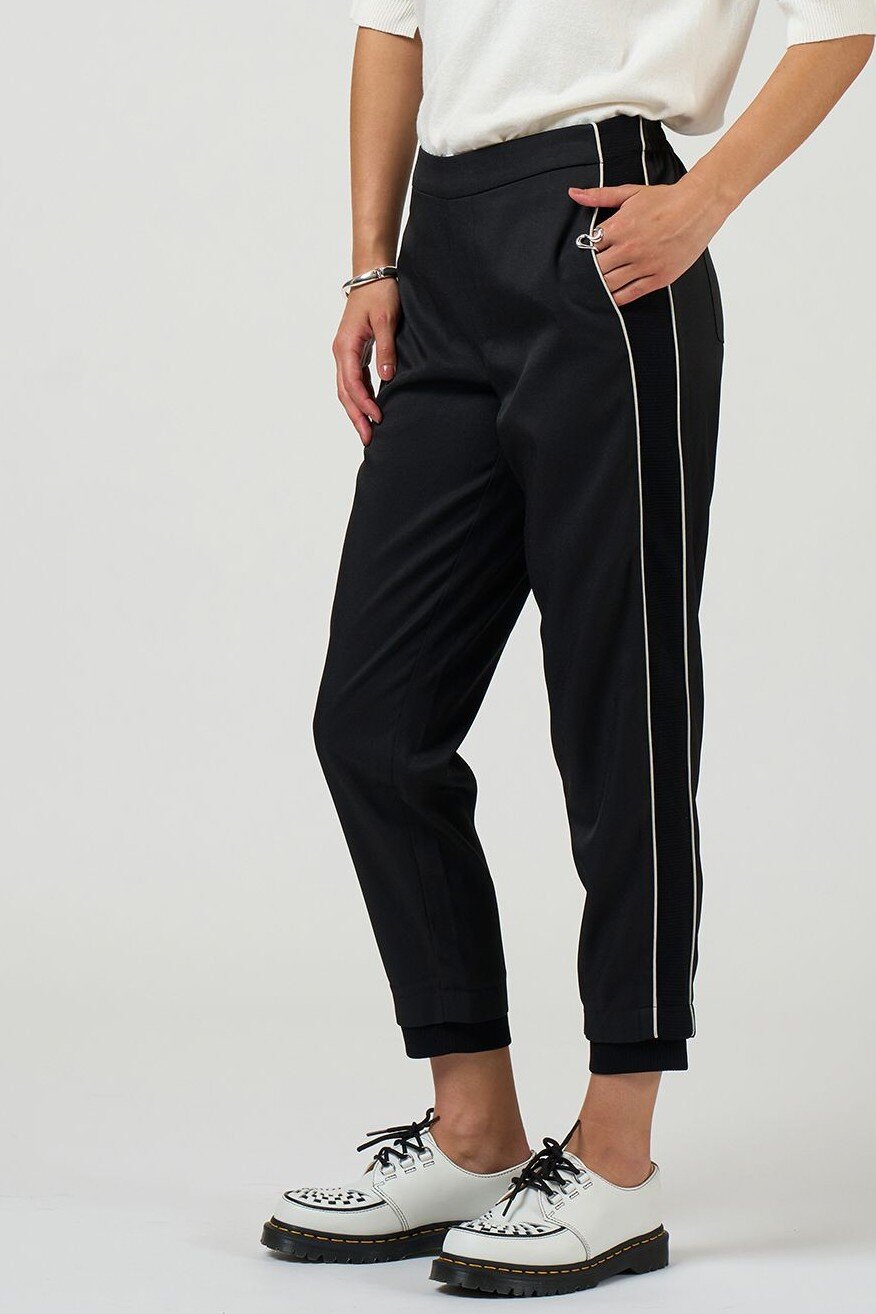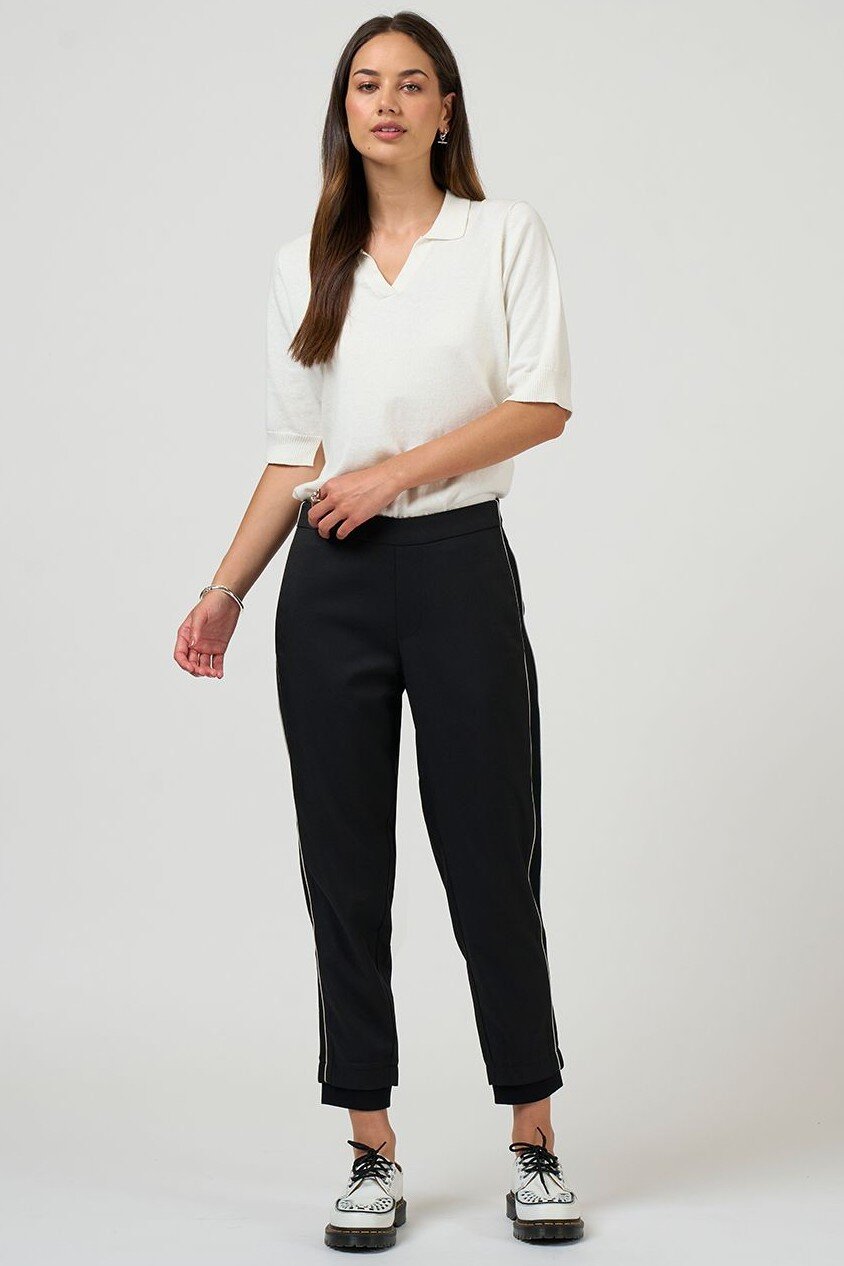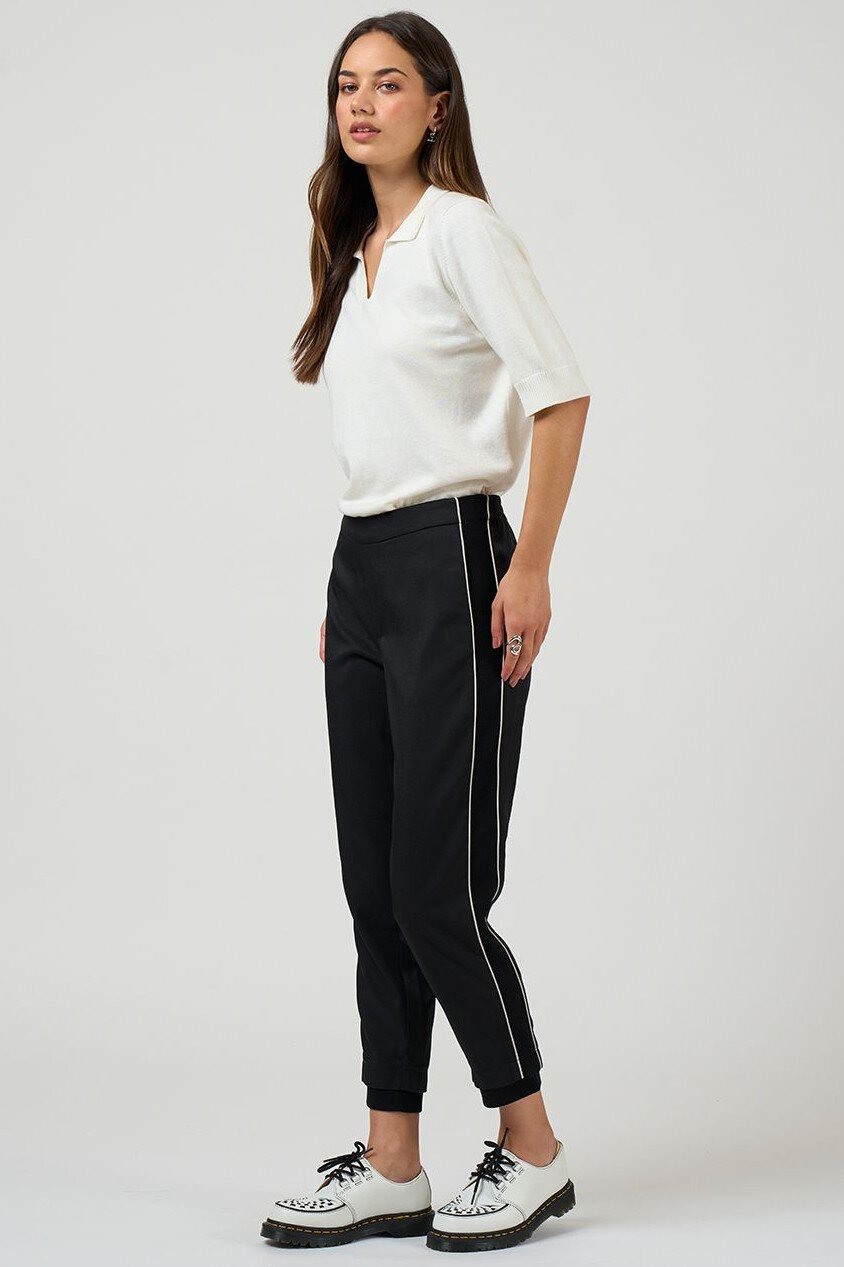 Relaxed fitting, pull-on pant with a tapered leg, with front and back pockets and elasticated back waist for ease and comfort. Featuring rib side panels and cuffs and fine contrast insert piping detail.