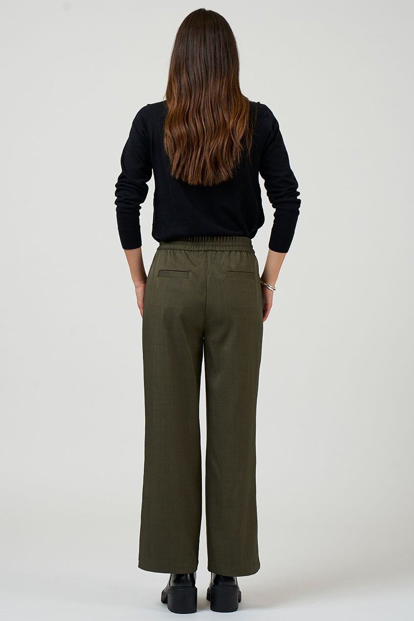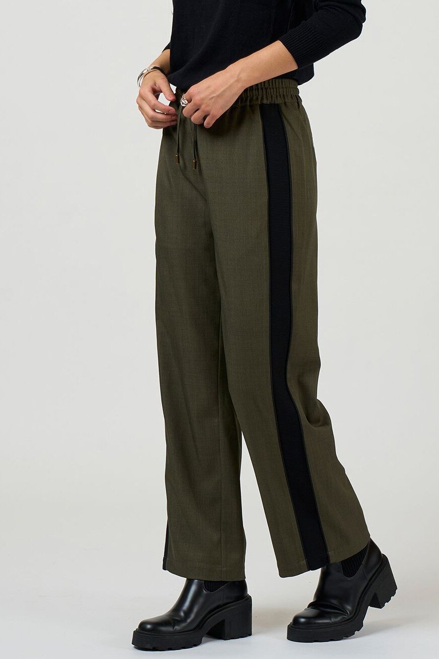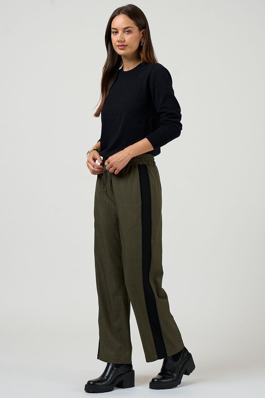 Straight leg pant with rib side panels and fine contrast insert piping, with elasticated drawstring waist and flattering forward seams with splits at the hem.