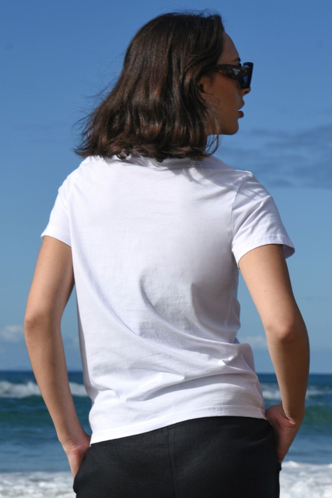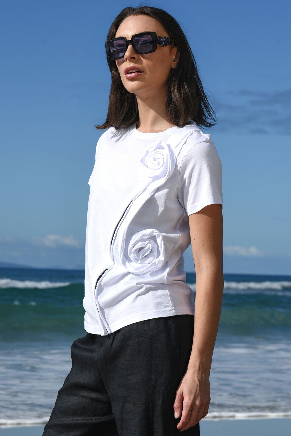 Boasting a floral rosette as an expressive interpretation of a staple, the ‘Flower of Love’ t-shirt, is an elevated piece that is a wardrobe must-have. Crafted in our favourite ‘Cotton’s up’ fabrication, the floral rosette add a touch of femininity, with contrasting Trelise Cooper tape peaking through for edge. Pair with your favourite spot print fabrication to tie looks together with effortless ease.
