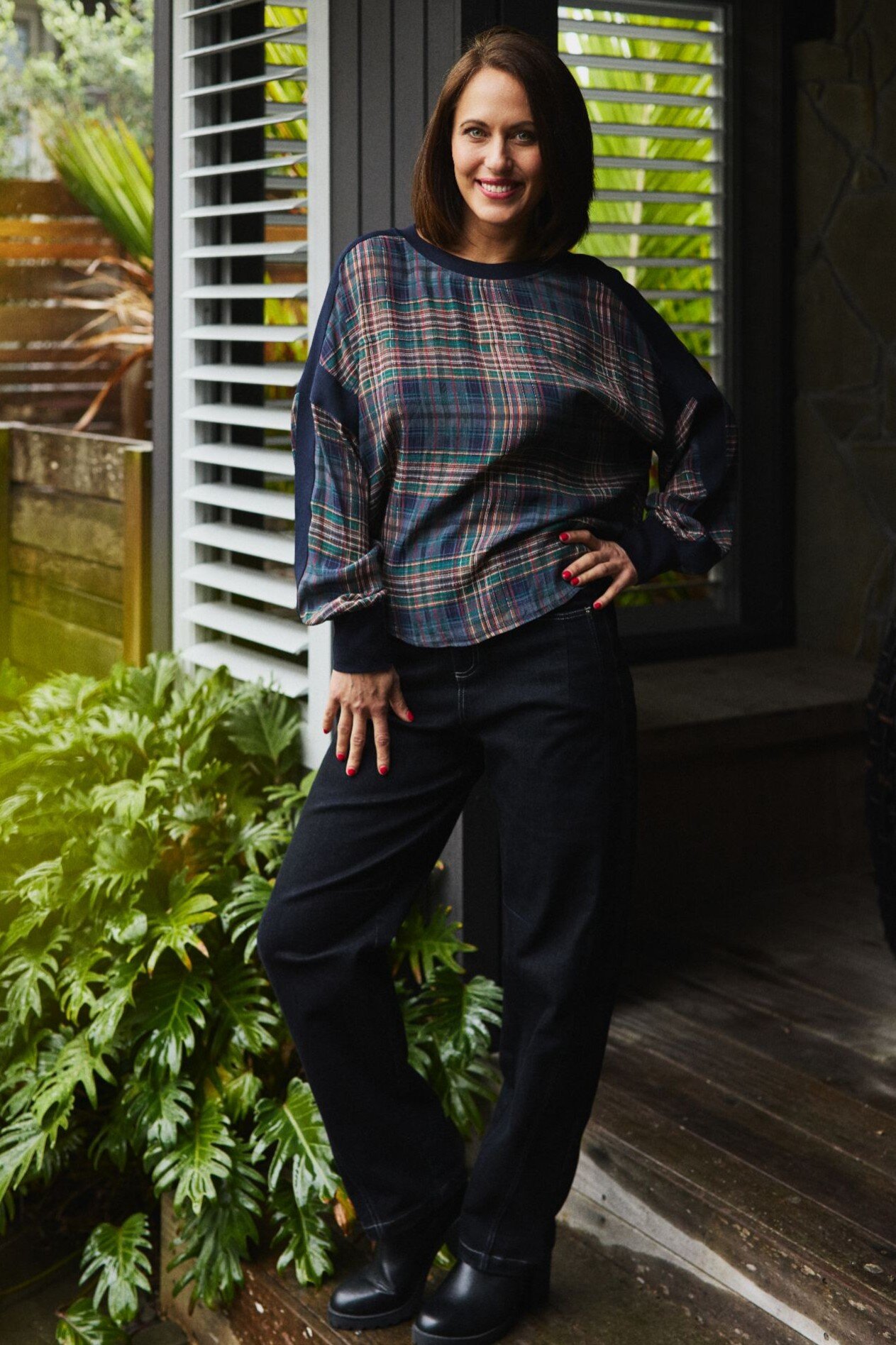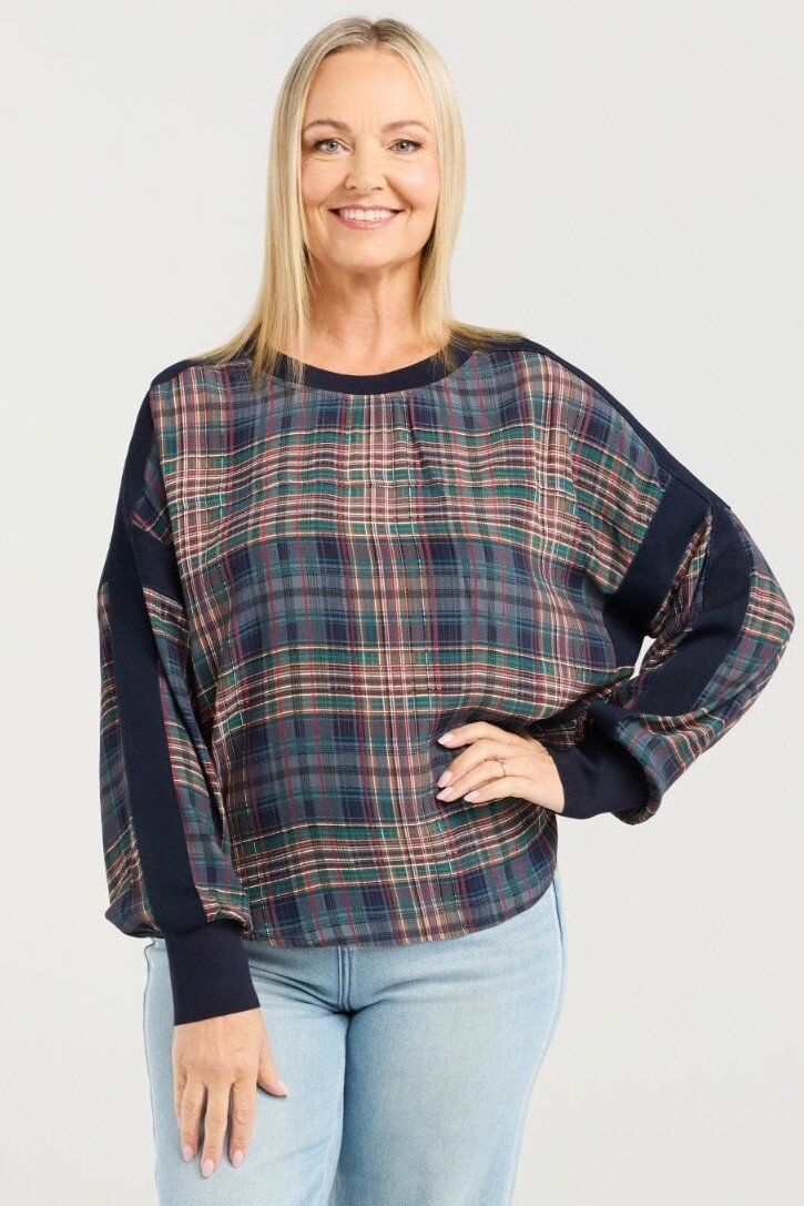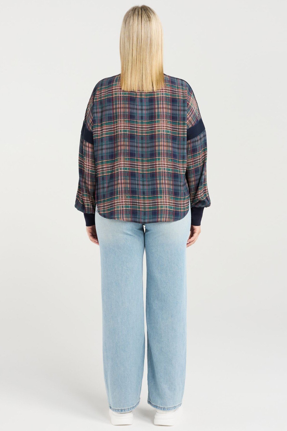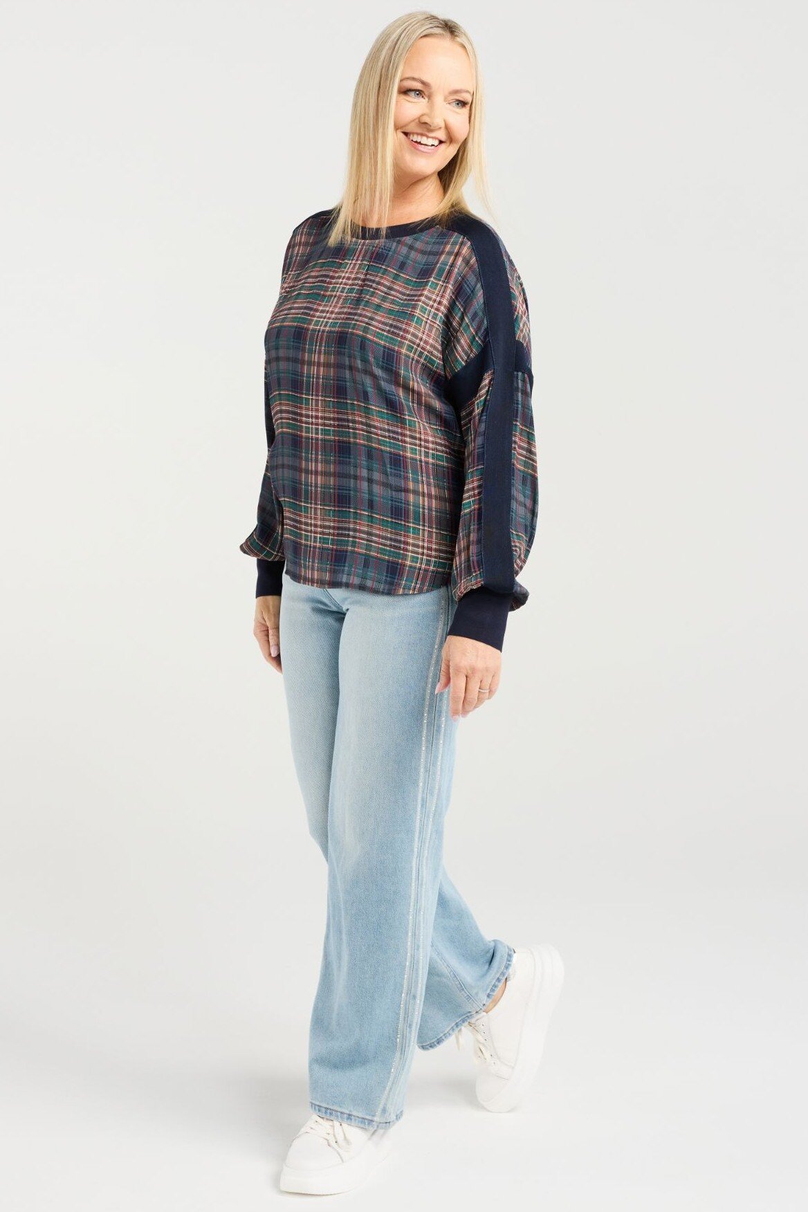 This long-sleeve top features wide elasticated cuffs and subtle panelling on the sleeves in classic plaid fabric. A timeless design with modern detailing, it adds understated elegance to any outfit.