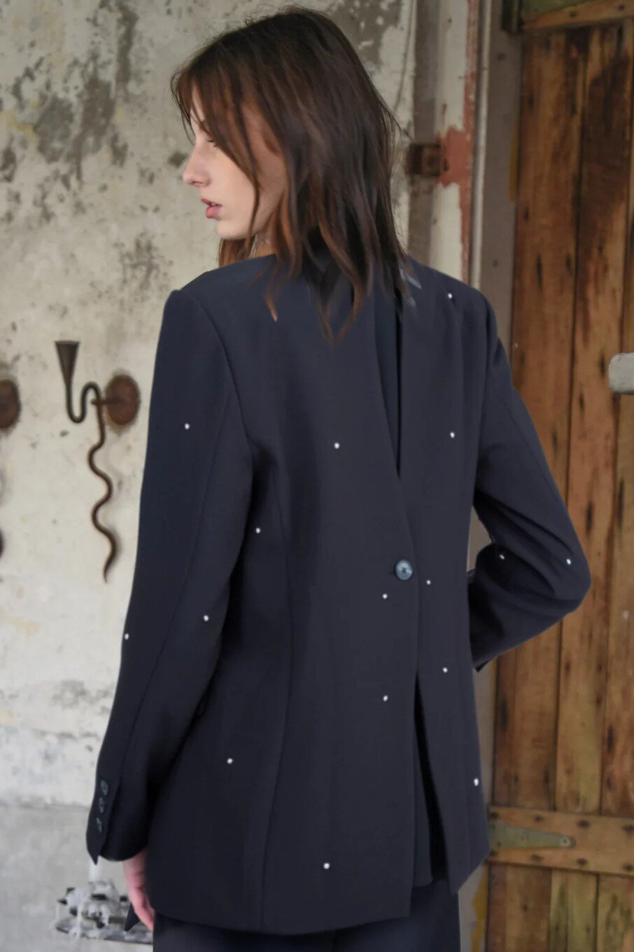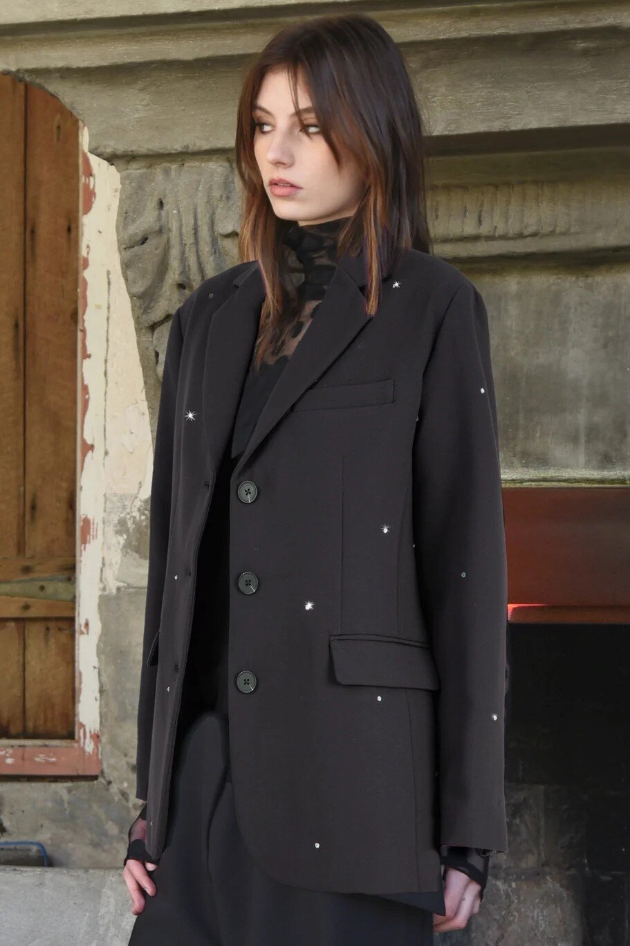 Defined by sparkling diamanté embellishment and a striking split-back detail, the 'Top of the Peak' blazer brings a touch of after-dark glamour to classic tailoring. Cut in our 'Suit My Style' crepe suiting, it features a single-breast button front, sharp notched lapels and front flap pockets for a polished finish. Buttoned cuffs and a softly draped yoryu underlayer add movement and sophistication, while full lining ensures a smooth, refined fit. A standout piece that elevates any wardrobe.