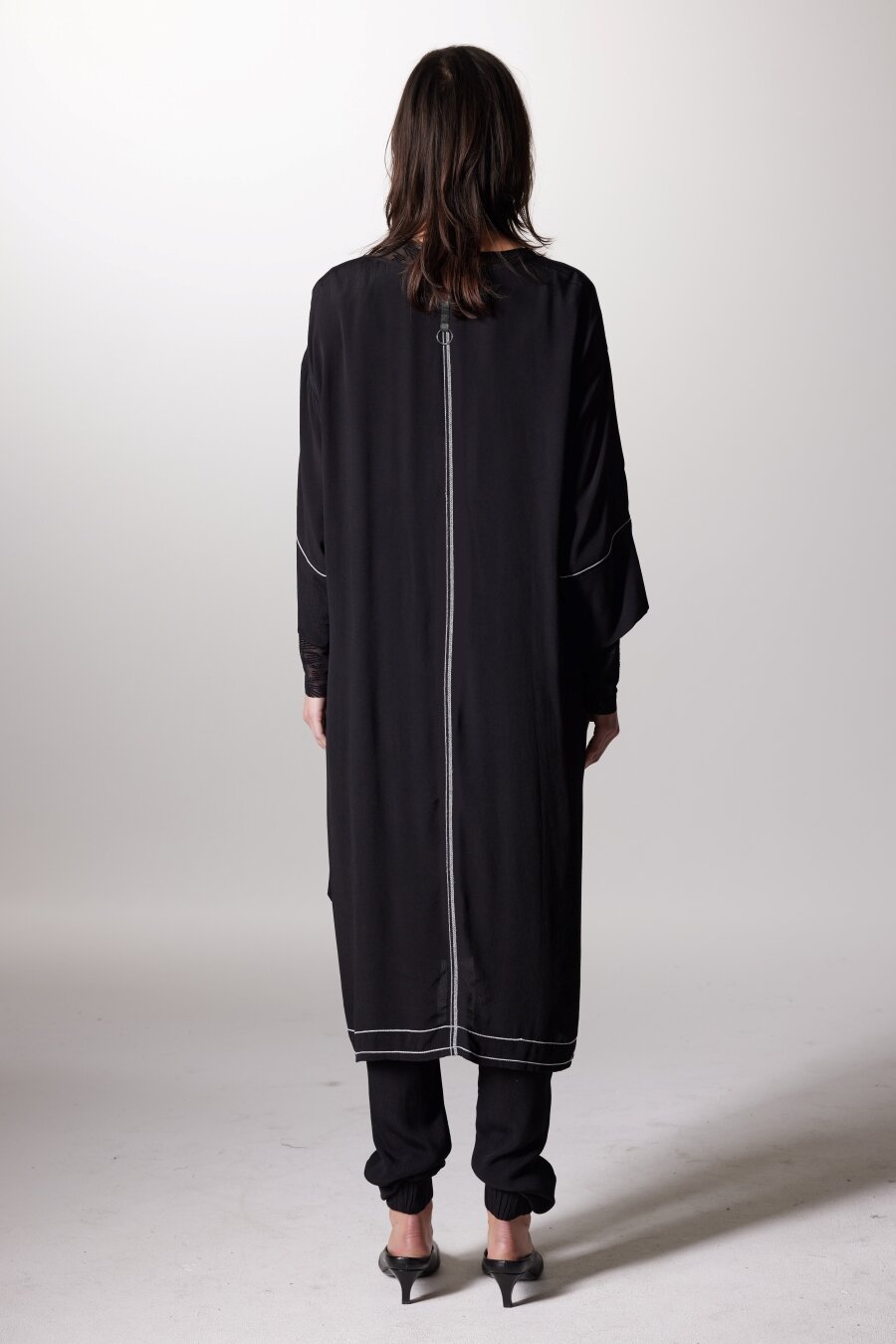 Add an effortless elegance to your look with this modern below knee length dress. It has a single ties at front left to create light waistline gathering and can be adjusted as desired. The round shape neckline is finished with self fabric binding. Decorative stitching at centre front and back seam, hem and sleeves.