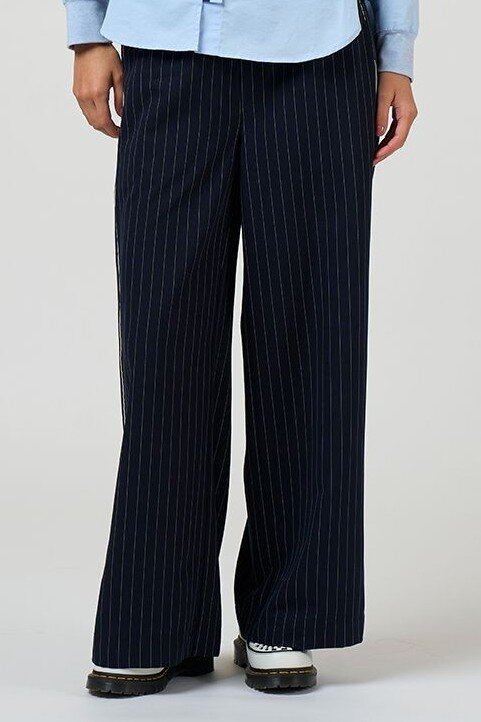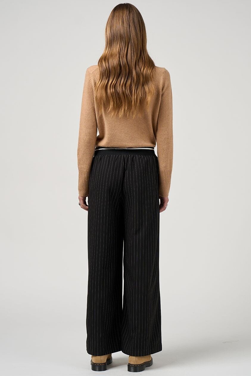 Wide leg pull-on pant with a stripe rib waist band and contrast piping at forward side seams.  Functional front pockets.