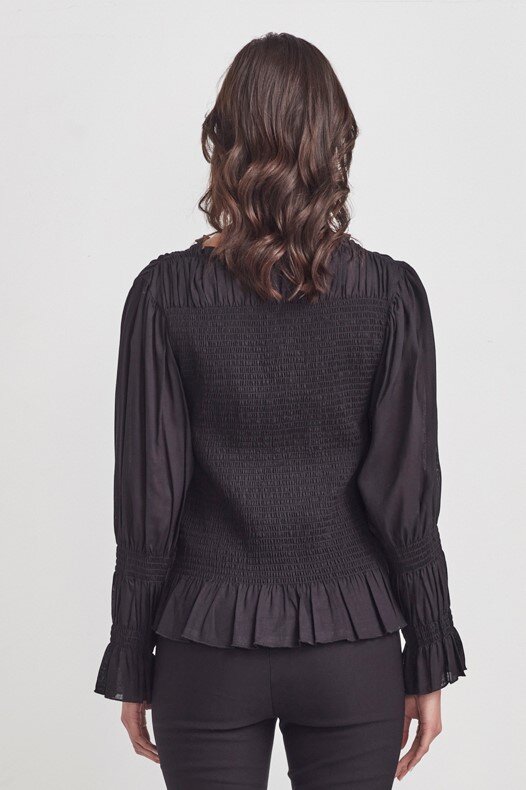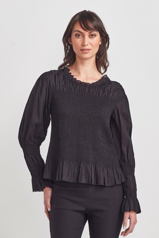 Viscose/Linen top with shirred body and sleeve detail. Rounded soft elasticated neckline. Set in sleeve with gather at the shoulder. Bracelet length sleeve with frill cuff. The True top falls to the hip.