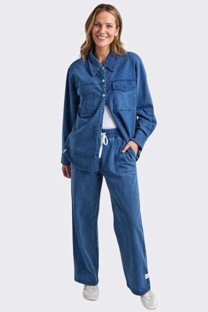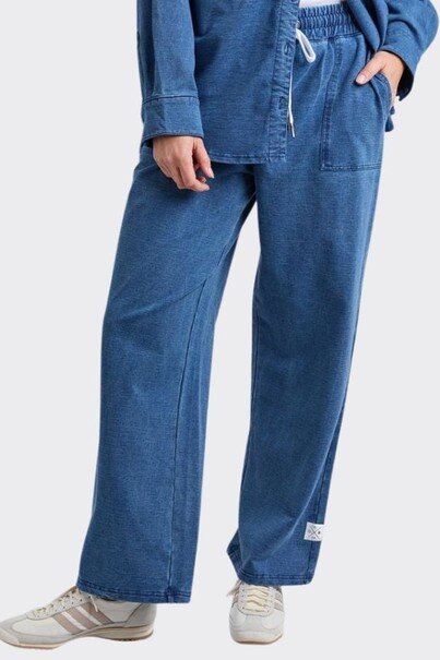 The Elm Valerie Track Pant combines comfort and style in a straight-leg silhouette crafted from soft denim-look cotton. With a high-rise waist and relaxed fit, these track pants are perfect for effortless daywear.