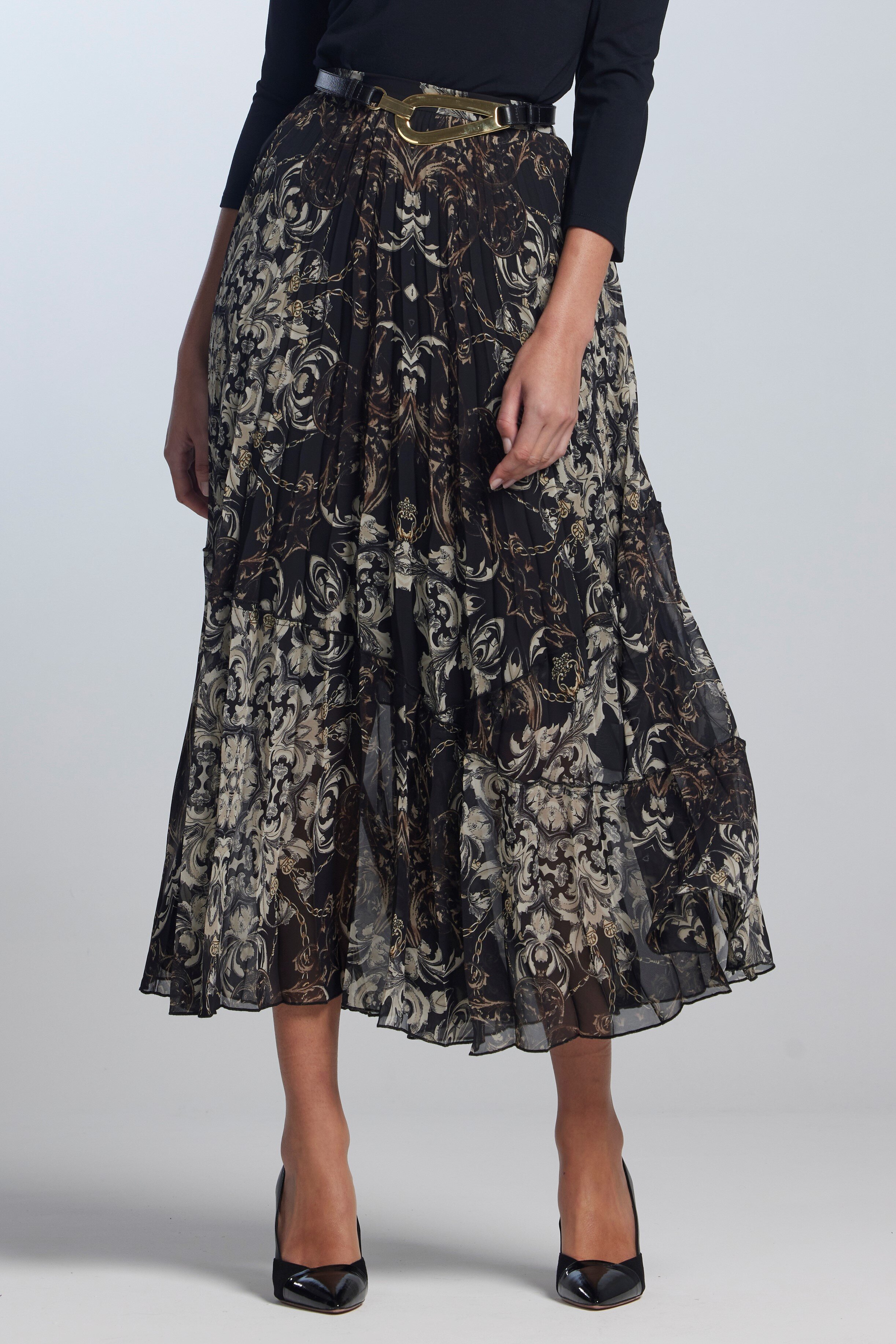 A classic full-length sunray pleated skirt. Made in Venezia Print chiffon with a lightweight chiffon lining. Looks stunning worn with slim-line tops and shorter jackets, a skirt that suits any occasion.