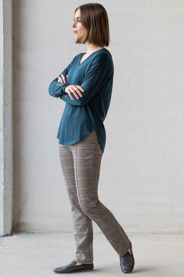 Long-sleeve merino top in Dragonfly - a rich dark teal. Designed with a relaxed silhouette and drop-shoulder shape, this style features a V neckline and statement buttoned cuffs, offering an elevated take on an everyday merino layer.
