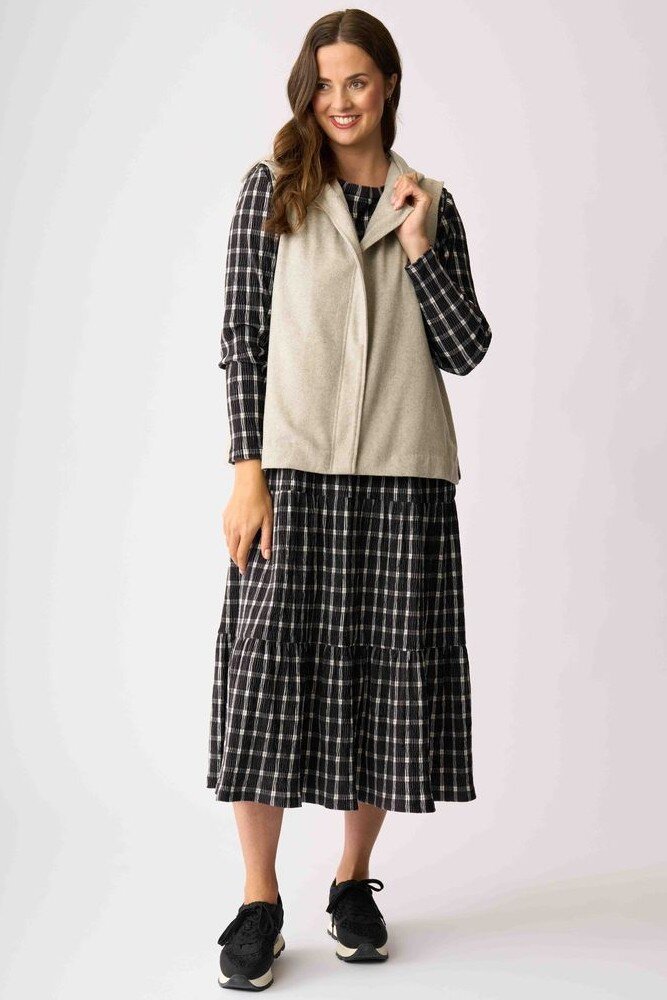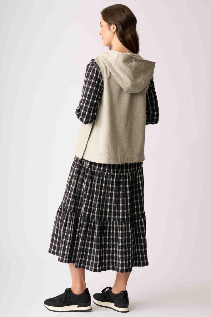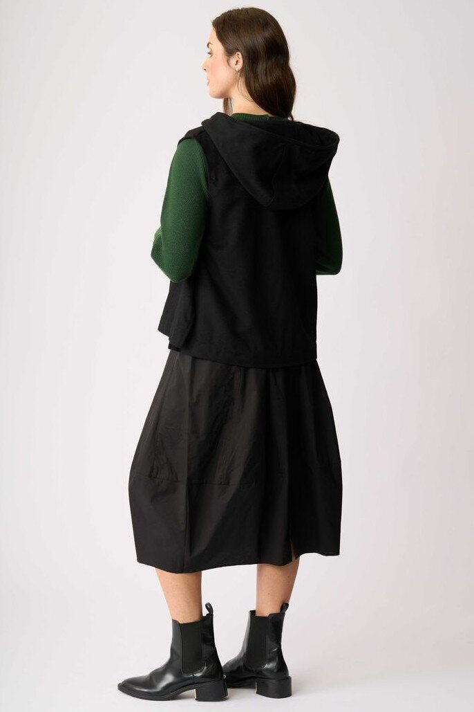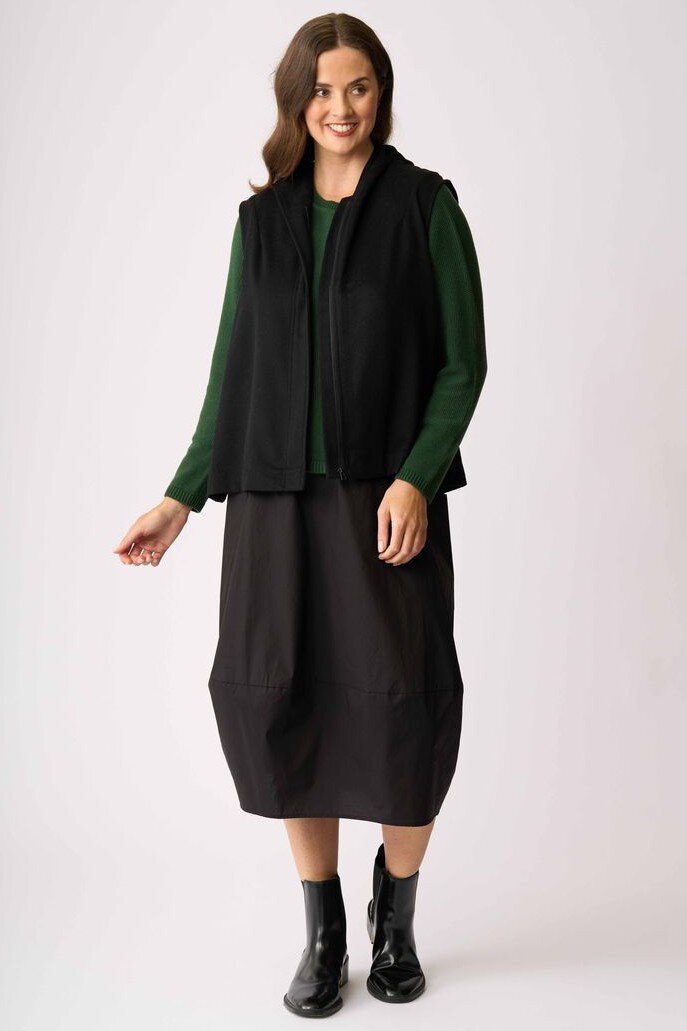 The perfect throw on layer - very casual yet very sophisticated and versatile for everyday! This vest has a hood and zip up front.