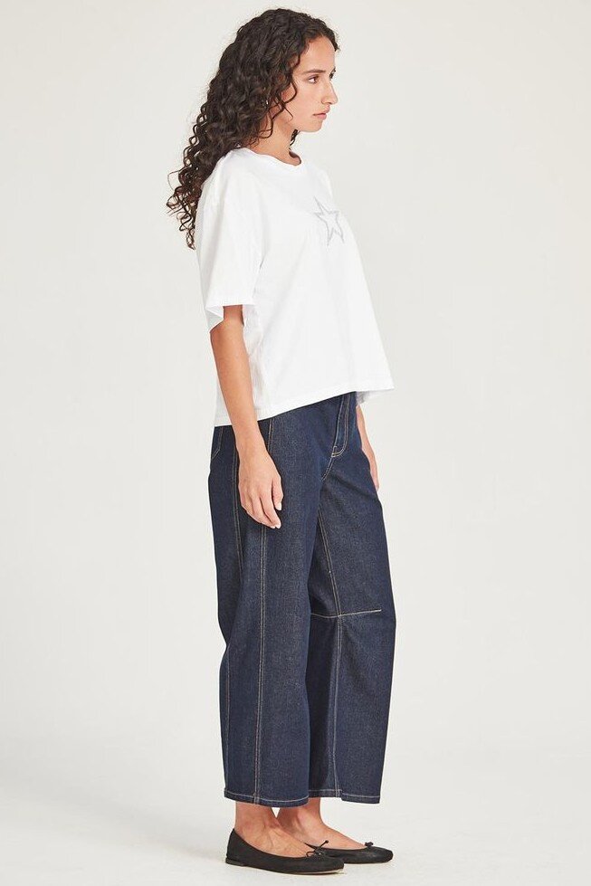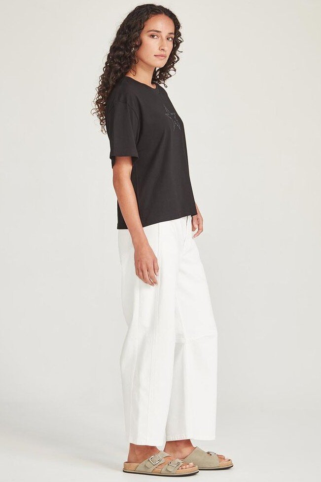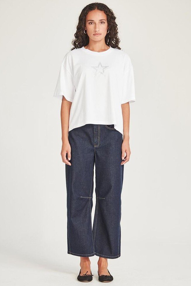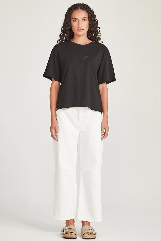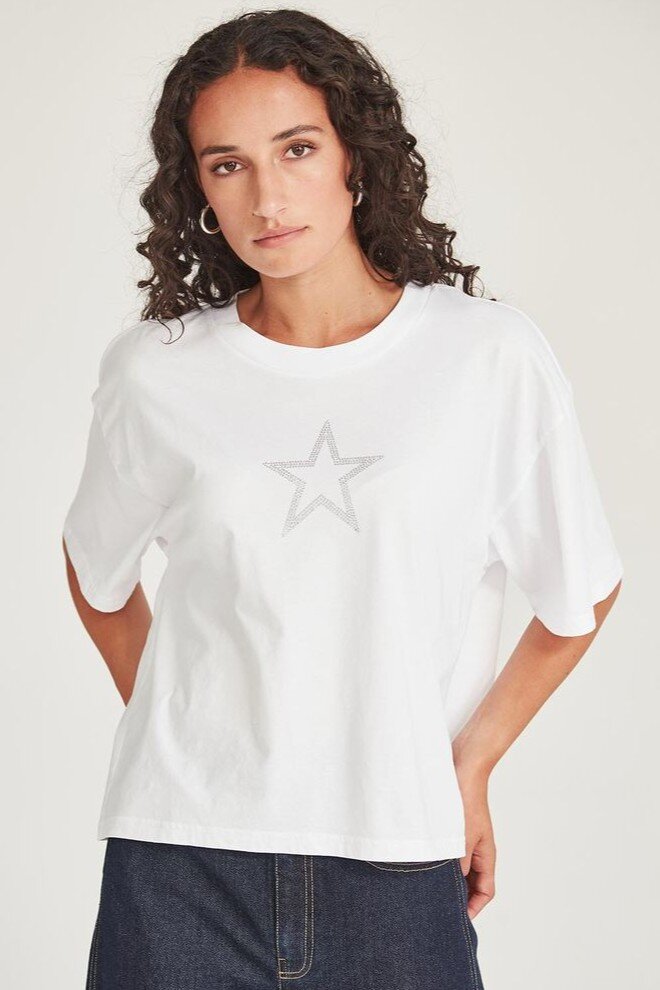 An ode to Bowie. The Ziggy Tee is made in an organic cotton and features a diamanté appliqué star at the front.Crew necklineShort sleeveDiamanté star detailBoxy fit