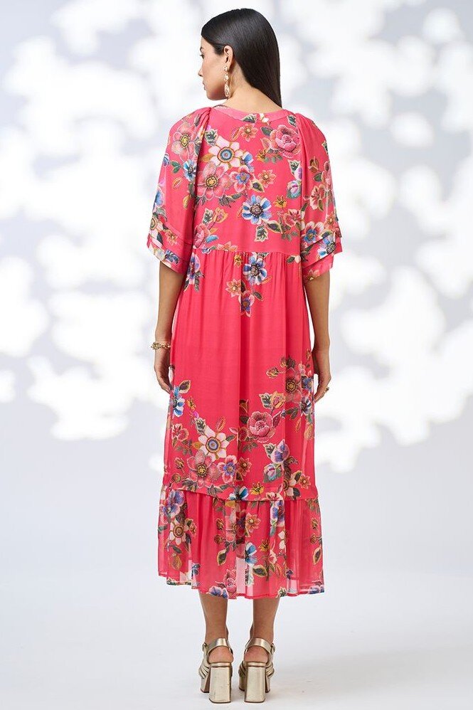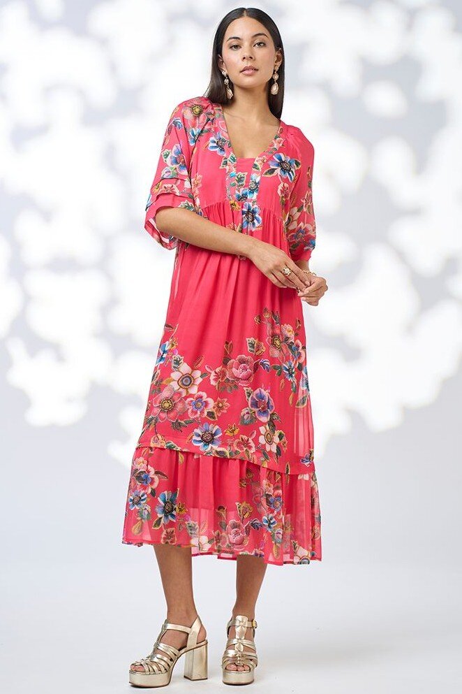 Printed dress with a panelled front to give the impression of a V neckline, with a gathered skirt. Sleeves and hem panel feature tucks to add detail. Lined through body.