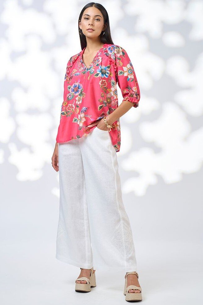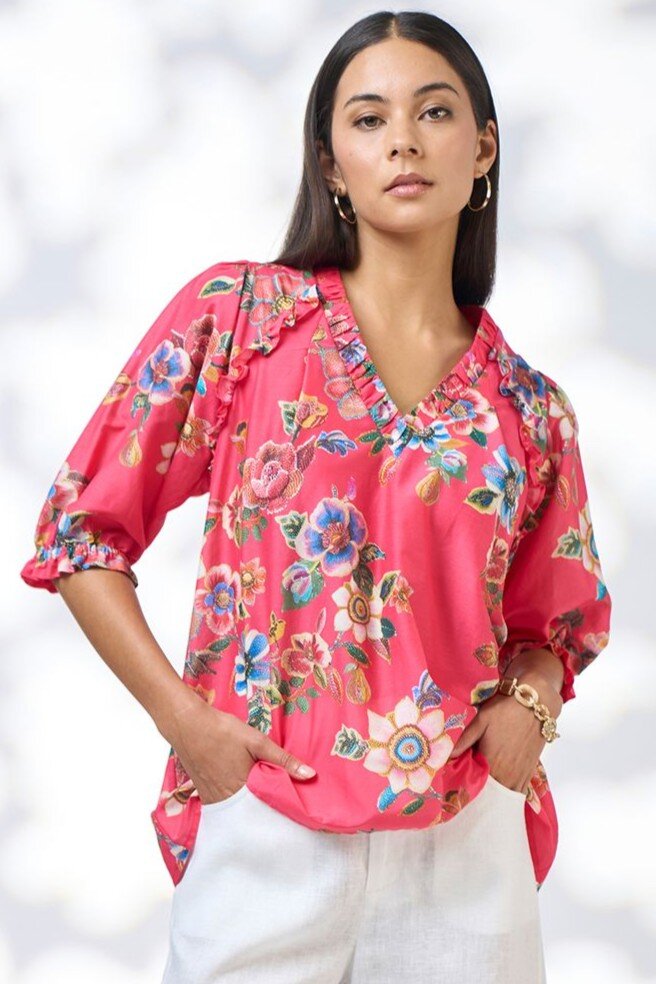 Silk cotton voile top with a ruched V-neckline, with tuck detailing, and ruffle raglan seams, and small ruffle elasticated cuffs.